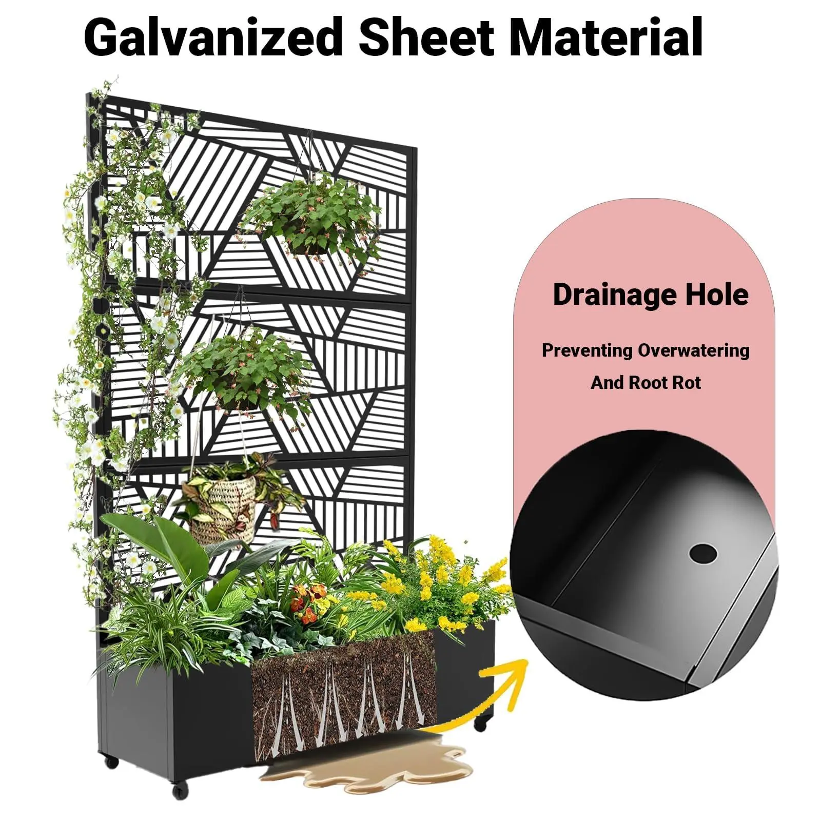 【Easy Mobility Planter Box】Designed for homeowners, gardeners, and outdoor enthusiasts, this planter box with wheels provides a stylish mobility plants trellis create a private retreat in your backyard. The locking wheels allow you to effortlessly reposition the planter to ensure your plants receive the optimal amount of sunlight and shade. No more heavy lifting or struggling with stationary planters.