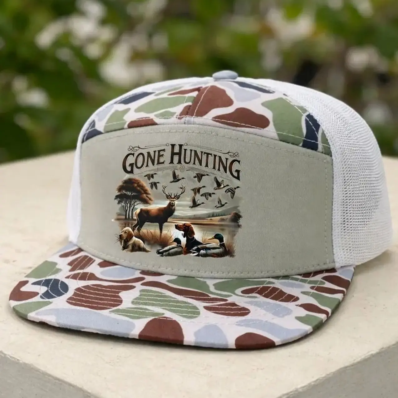 Gone Hunting Trucker Hat for Men, Deer & Duck Hunting Camo Snapback Cap, Flat Brim Mesh Outdoor Hat, Adjustable Hunter Gift for Him , Gift For Her