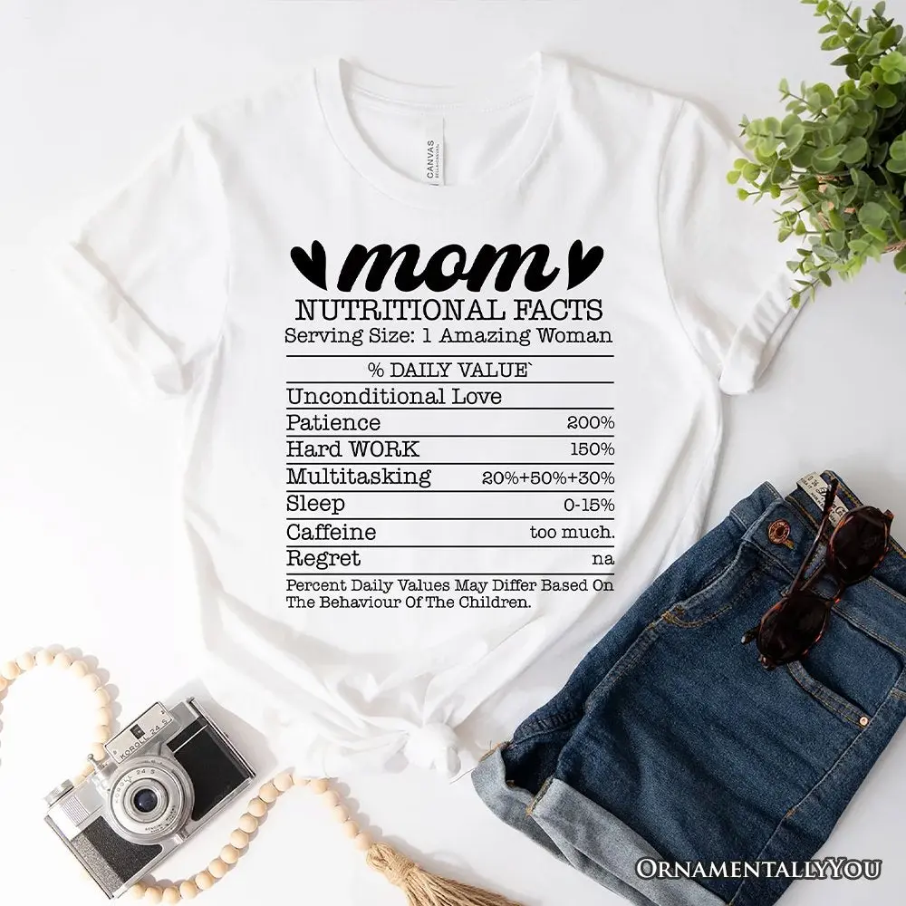 Mom Nutritional Facts Funny T-Shirt, White and Natural Mom Life Tee for Exhausted and Caffeinated Mothers