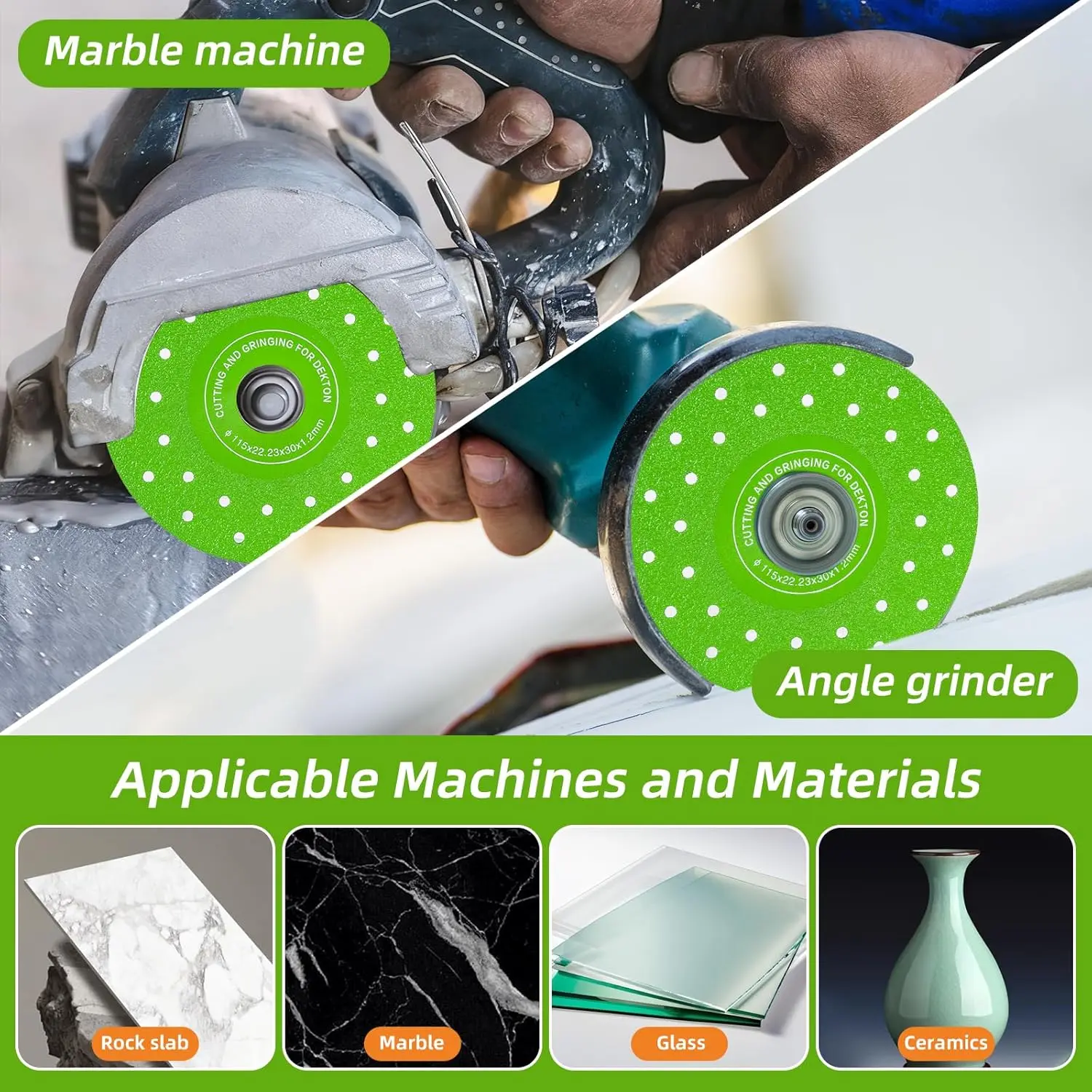 COMPLETE 4-PC DIAMOND BLADE SET - This diamond saw blades set includes specialized blades for various materials.Features multi-hole cooling technology to reduce heat buildup and extend blade life.Perfect as a glass cutting disc for mirrors, tile cutting disc for bathrooms, and rock slab grinding disc for stone work.