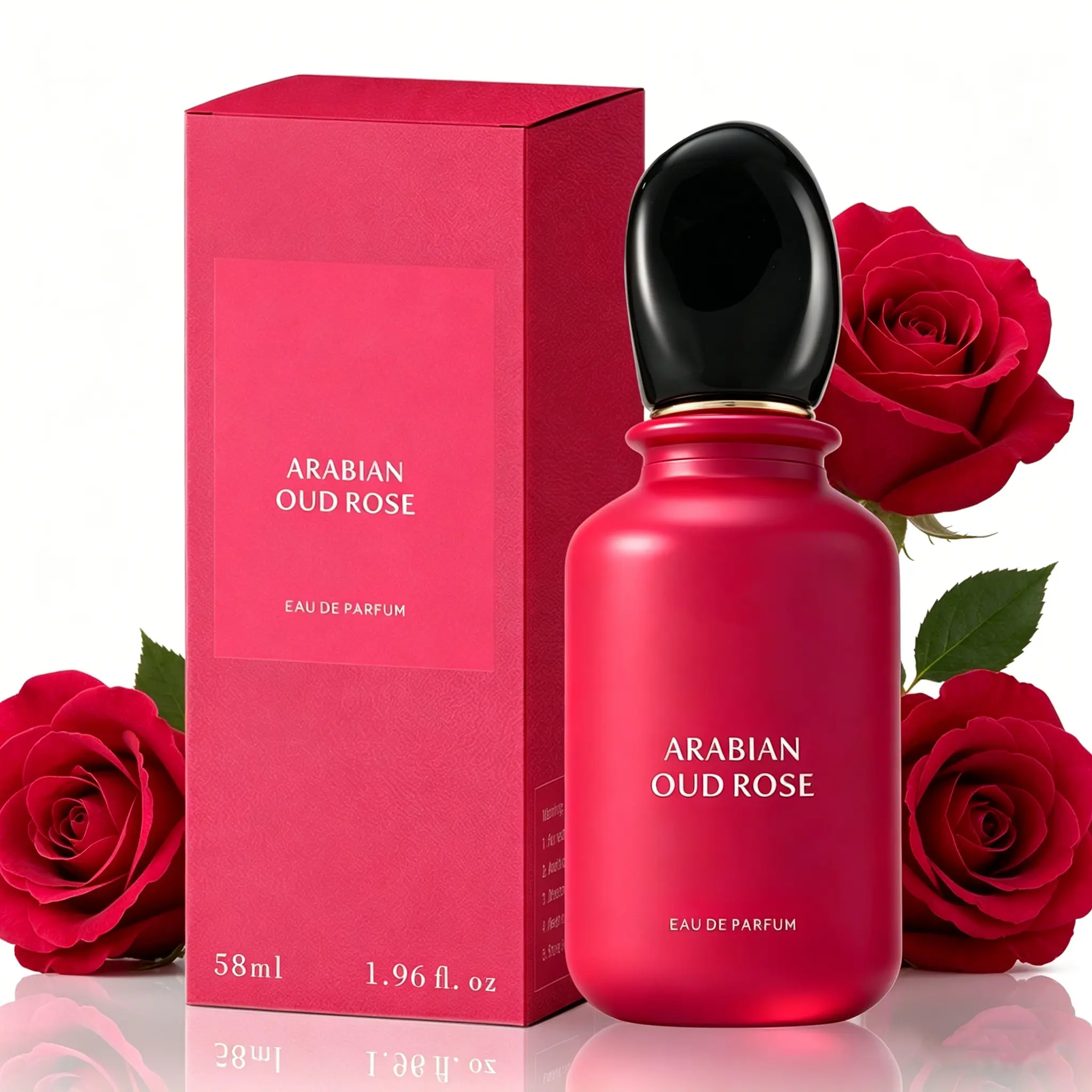 Discover the enchanting Arabian Oud Rose Eau De Parfum in a luxurious 58ml (1.96 oz) bottle. This fragrance blends saffron, pink pepper, Damascus Rose, geranium, Oud, amber, and leather for a long-lasting aroma. Perfect as a gift for women who appreciate luxury. The bottle's design exudes elegance, making it a standout addition to any collection.