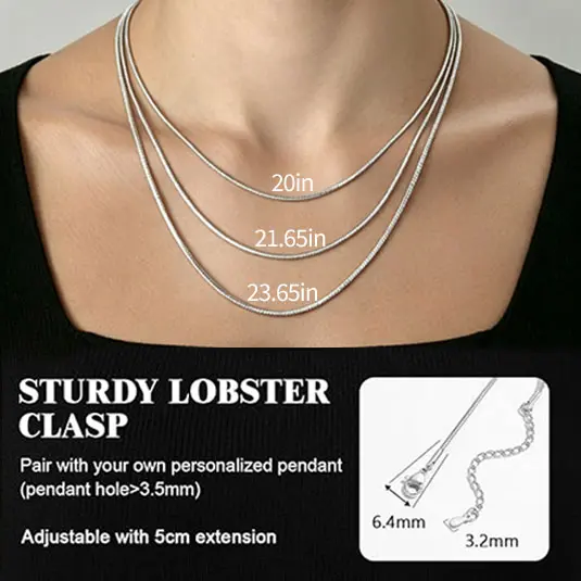 This necklace boasts a multi-layered stacking design with fine snake chains and a smooth silver finish. Its minimalism and structure are ideal for personalized pendants, creating a stylish layered look. Perfect for men and women, it fits pendants or wears alone.