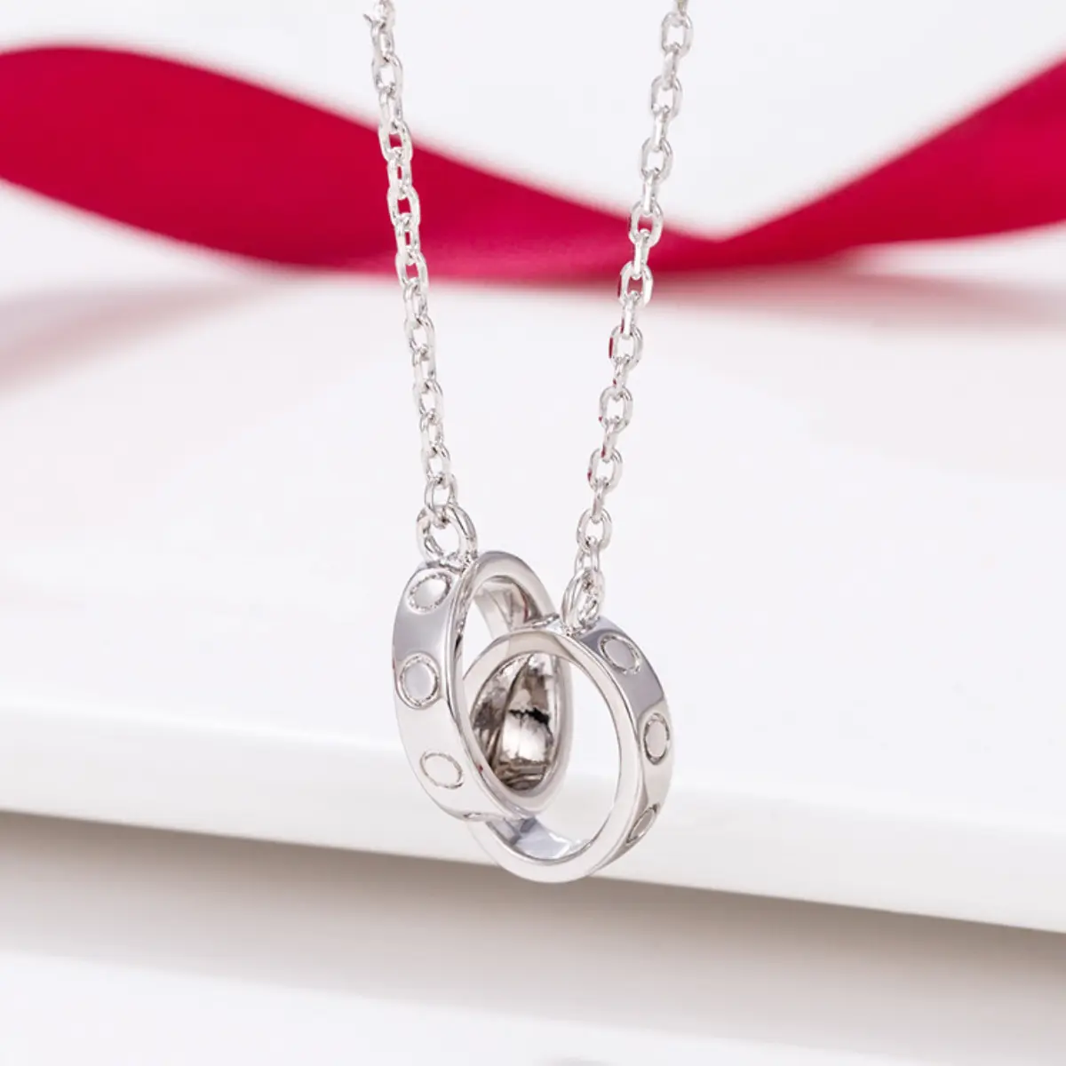 The necklace features a delicate, fine-link chain that sits gracefully at the collarbone, ensuring a lightweight, comfortable fit for all-day wear. The focal point is a stunning double interlocking ring pendant, a timeless symbol of love, unity, and eternity. The two rings are expertly sculpted to intertwine seamlessly, creating a cohesive, sophisticated silhouette that exudes sophistication.