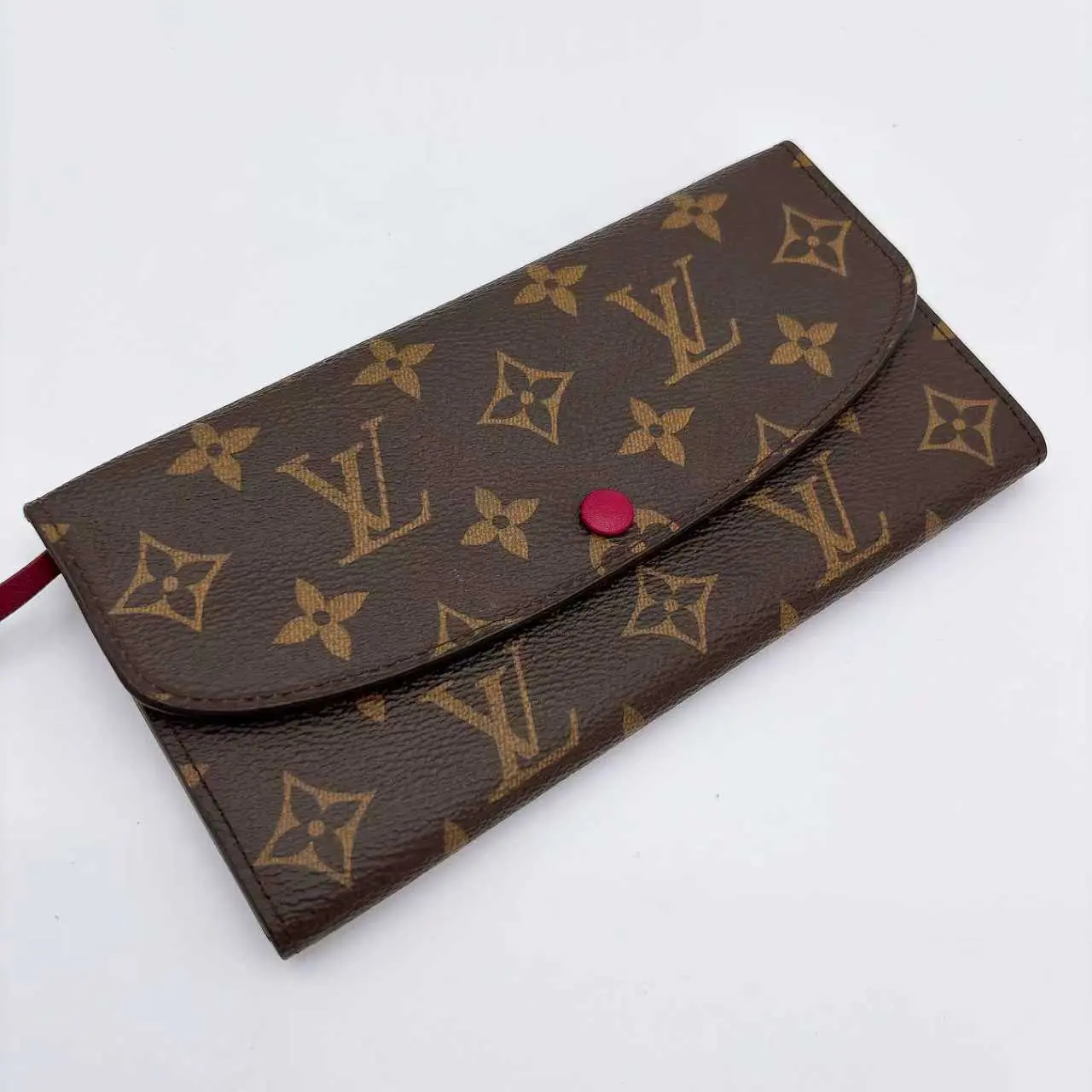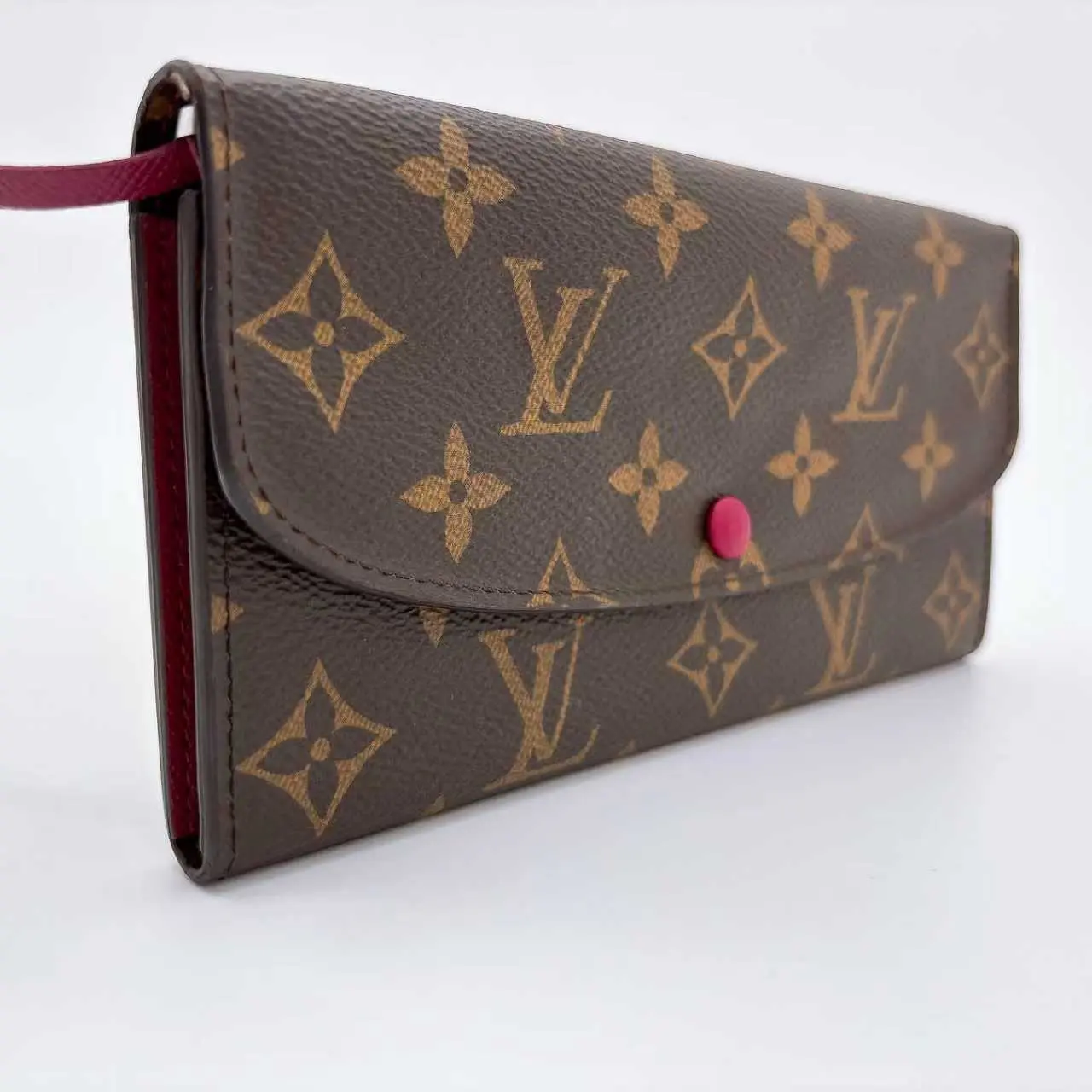 This is an authentic LOUIS VUITTON Monogram Emilie Wallet. This stylish wallet is crafted of classic Louis Vuitton monogram coated canvas in brown and features an envelope-style flap with a ballerina dark pink snap. This opens to a dark pink cross-grain leather and monogram canvas interior with card slots, patch pockets, and a zipper compartment.