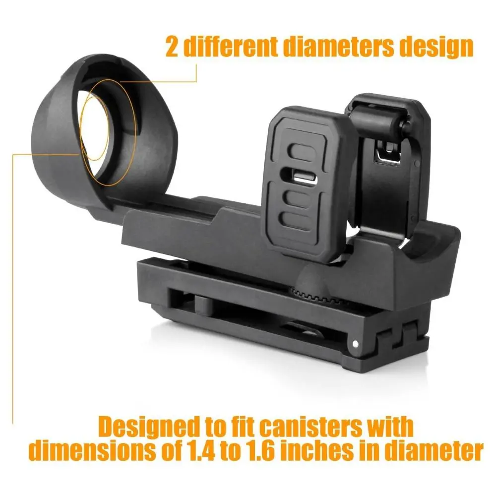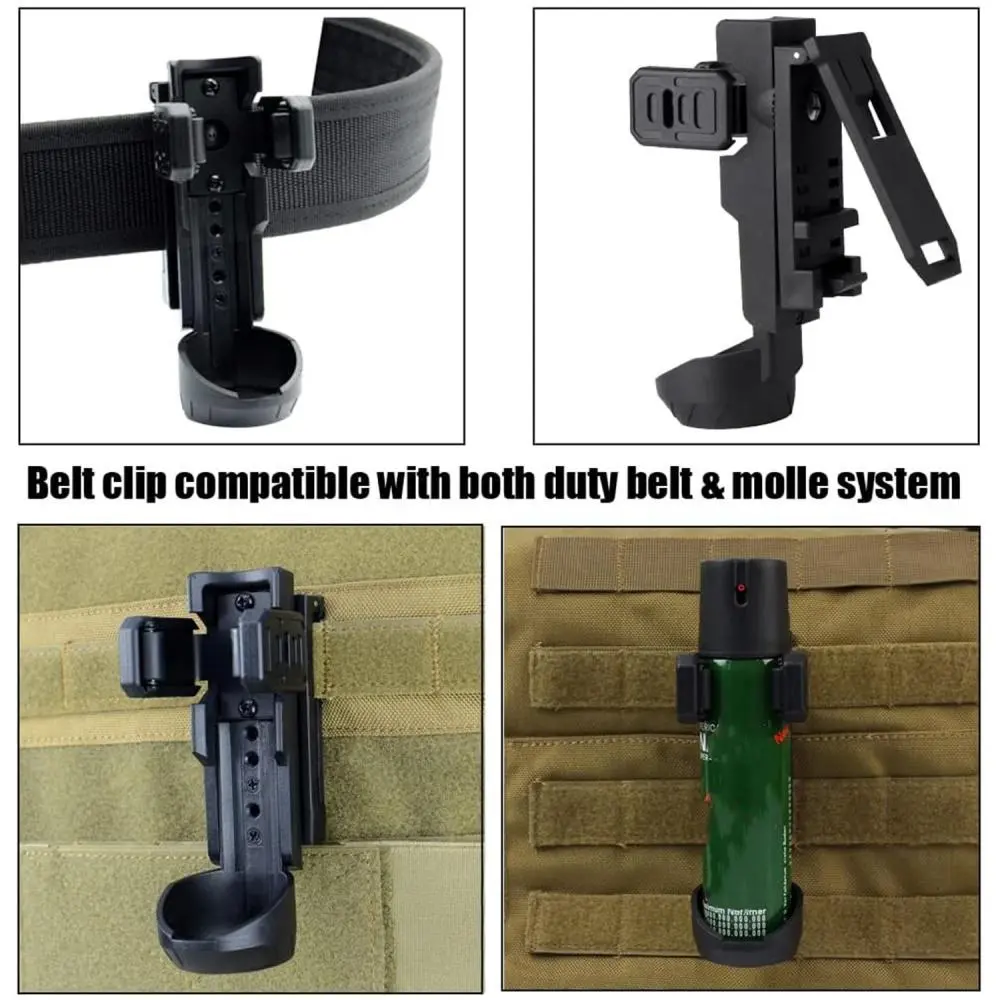 Quick-Release Secure Locking Mechanism: Features a positive retention system that firmly grips the canister to prevent accidental loss or drops during high-action activities, while still allowing for a smooth and instinctive draw when needed..360-Degree Rotatable Belt/MOLLE Clip: Equipped with a versatile clip that can be attached to duty belts (up to 2.5" wide) or MOLLE/PALS webbing, and rotated a full 360 degrees to customize the carry angle for optimal access and comfort..Universal Fit for 1.5" Canisters: Precisely engineered to hold most standard size OC, mace, or pepper spray canisters with a diameter of 1.5 inches, providing a secure and snug fit without excessive wobble..Durable Polymer Construction: Built from high-strength, lightweight polymer material that offers excellent durability and resistance to impact, wear, and harsh environmental conditions, ensuring long-lasting performance..Low-Profile & Lightweight Design: Designed to be minimalist and sleek, reducing bulk on your gear setup and preventing snagging on clothing or equipment, ideal for both overt and covert tactical applications.