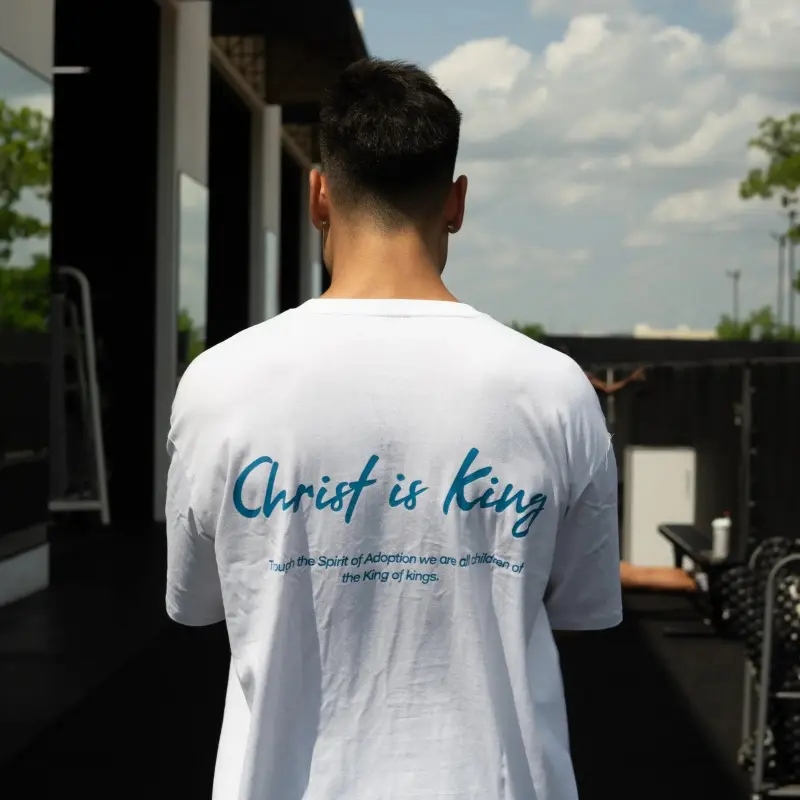 On the front: CHRIST IS KING - not a slogan, but a throne.On the back: "Through the Spirit of adoption, we are all children of God."This truth isn’t just worn - it’s lived.We don’t walk alone.We walk as sons and daughters of the Most High.
