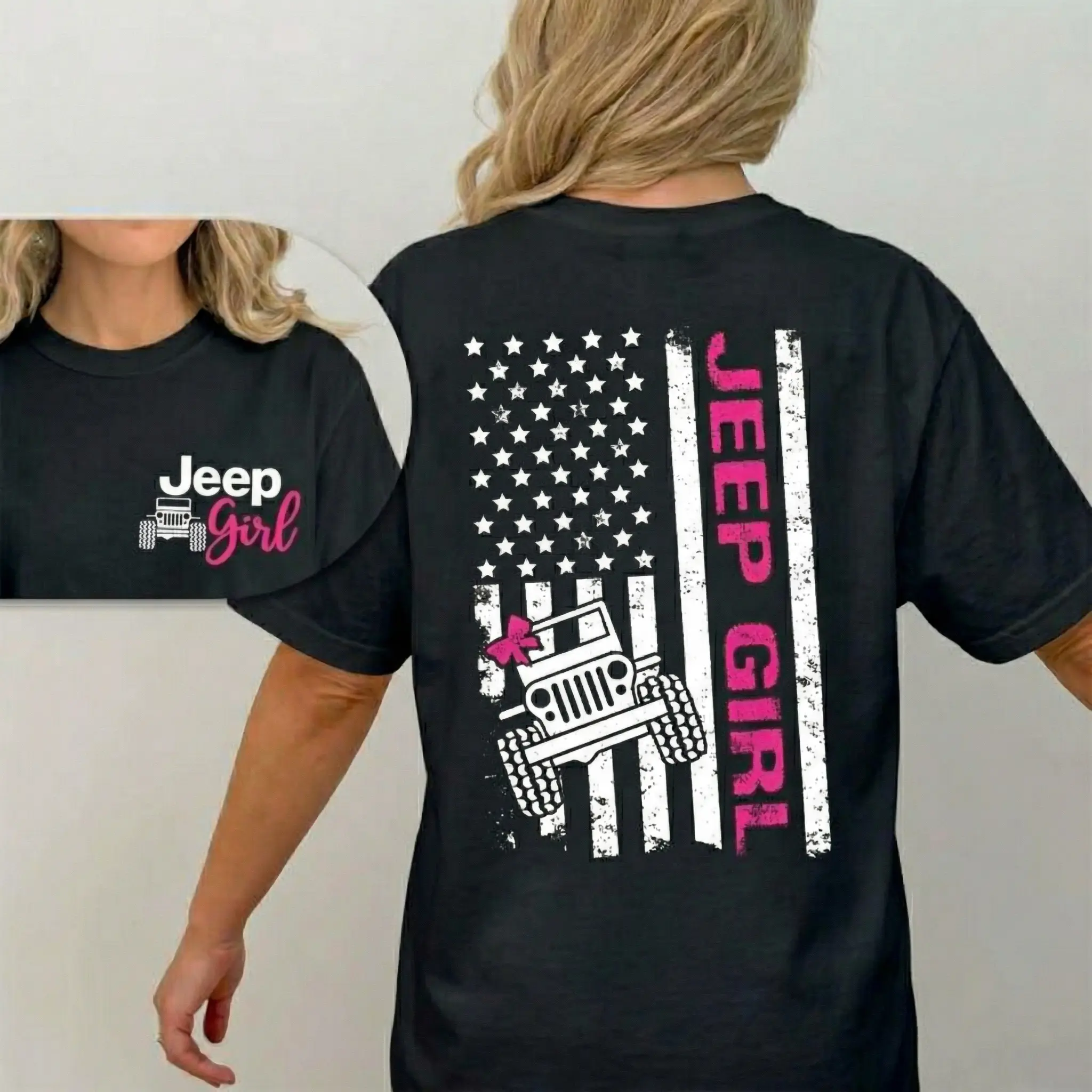 Jeep Girl T Shirt Cute Off-Road American Flag Graphic Tee Casual Street Style Trendy Tops for Unisex 100% Cotton
