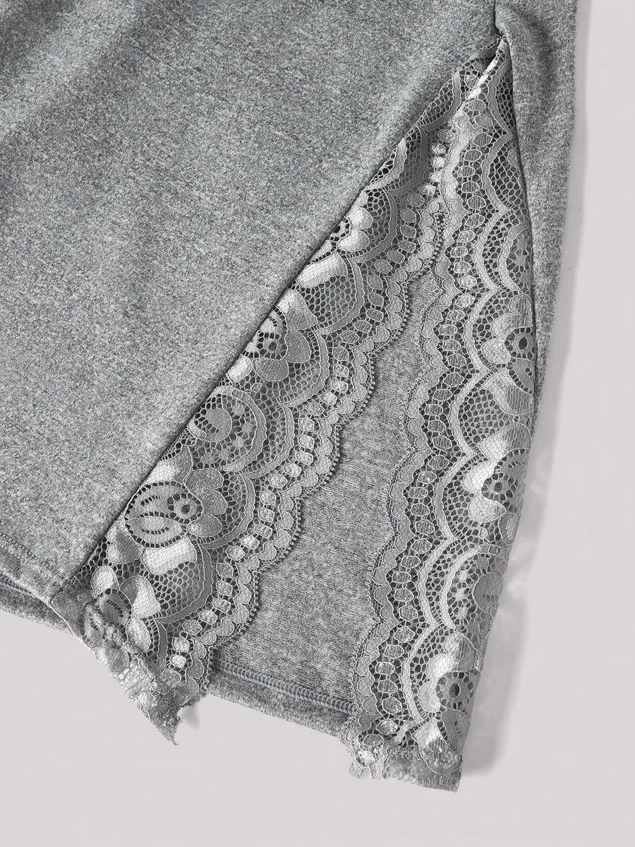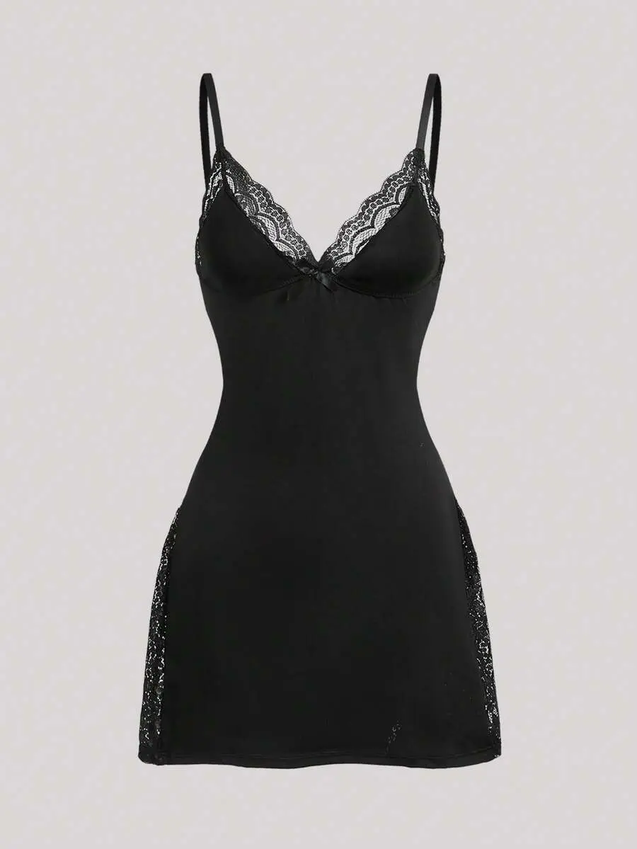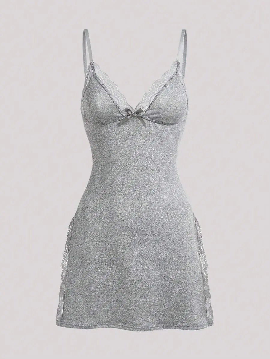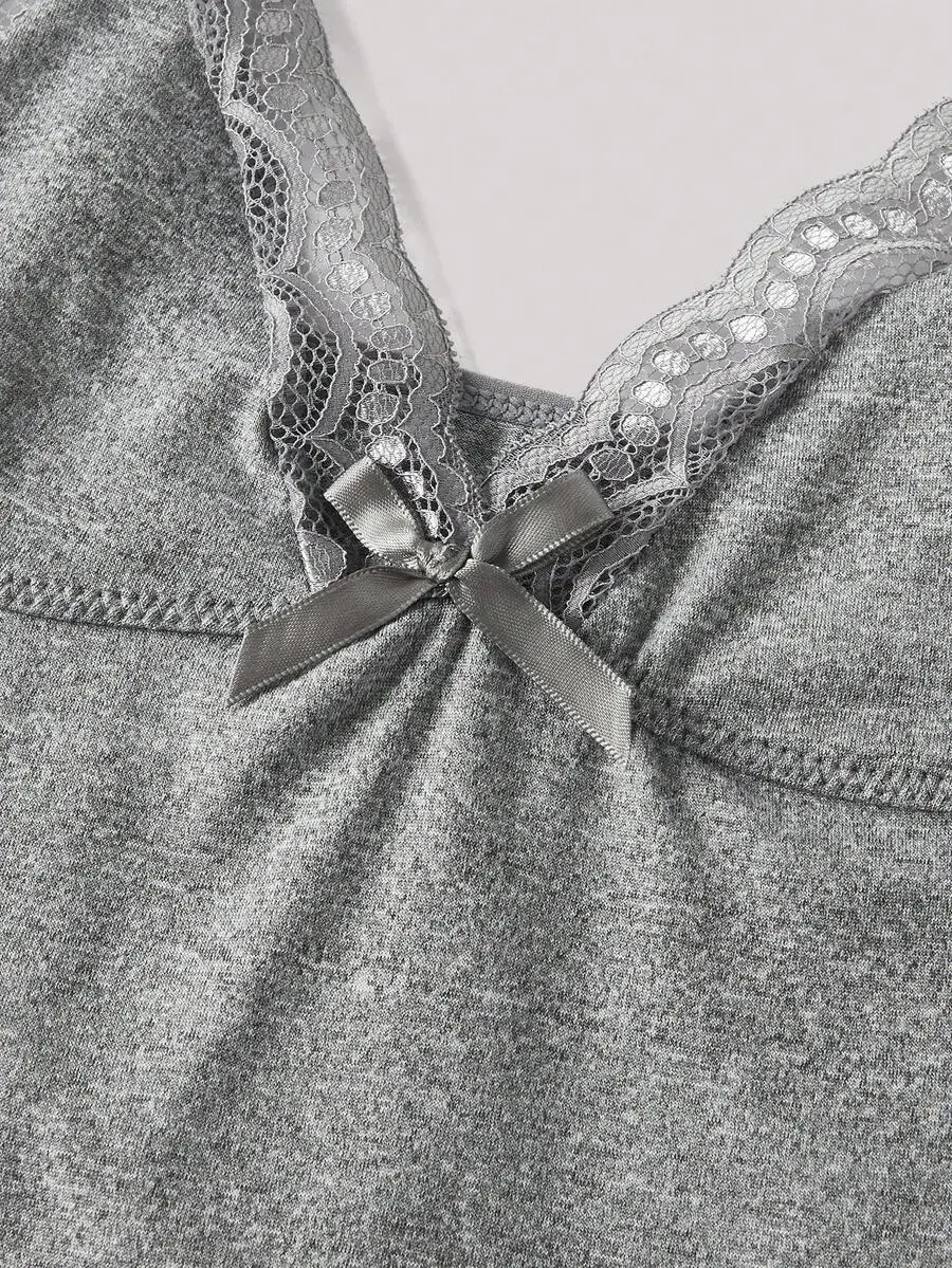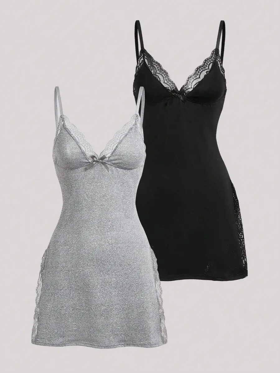 IYUNA 2pcs Lace Patchwork Bow Decor Romantic Side Slit Cami Nightgown