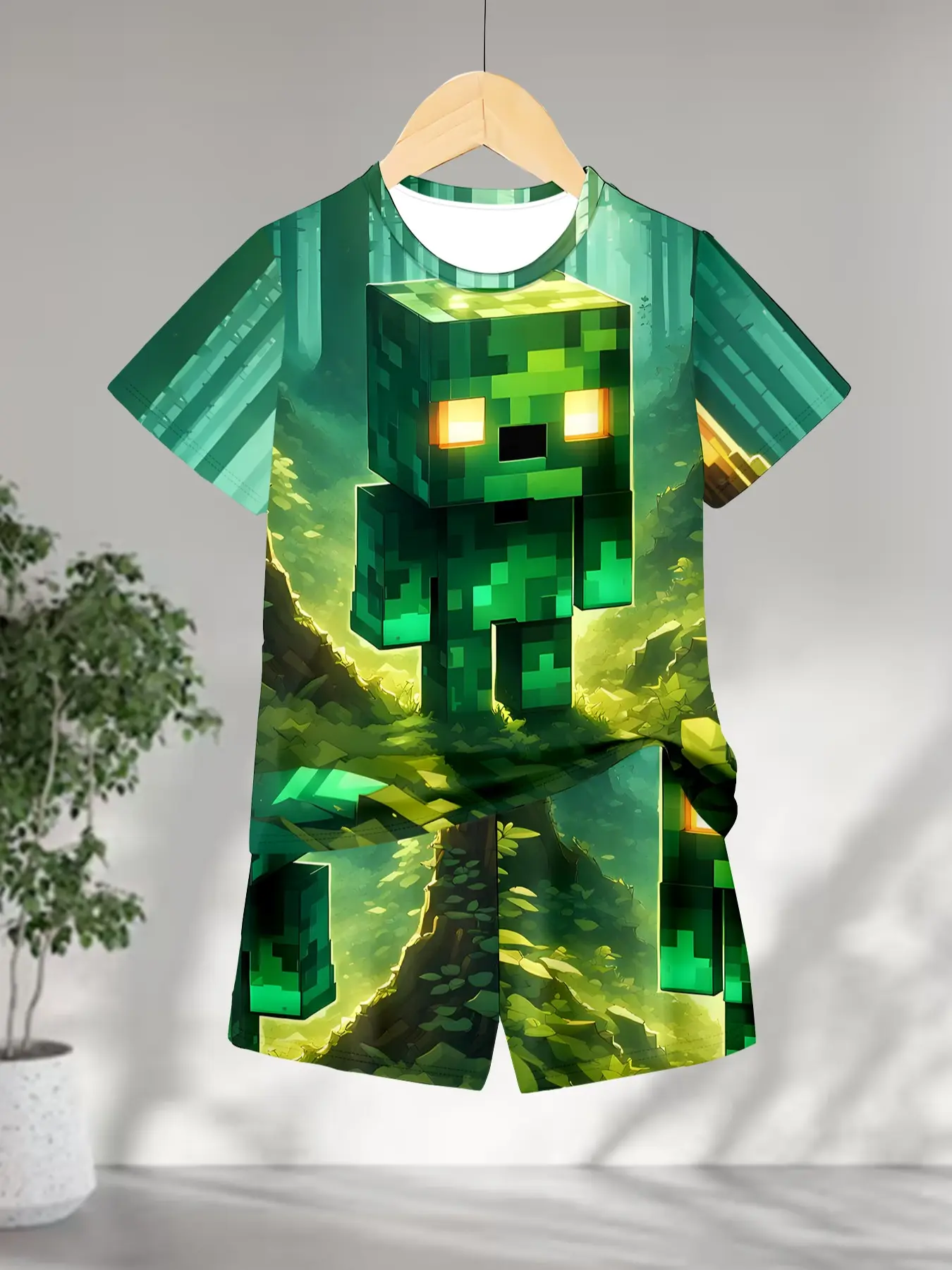 Boys' Creeper Pixel Print Short Sleeve Shorts Set, Casual Asymmetrical Design, Natural Waist, H-Type Silhouette, Random Print Pattern
