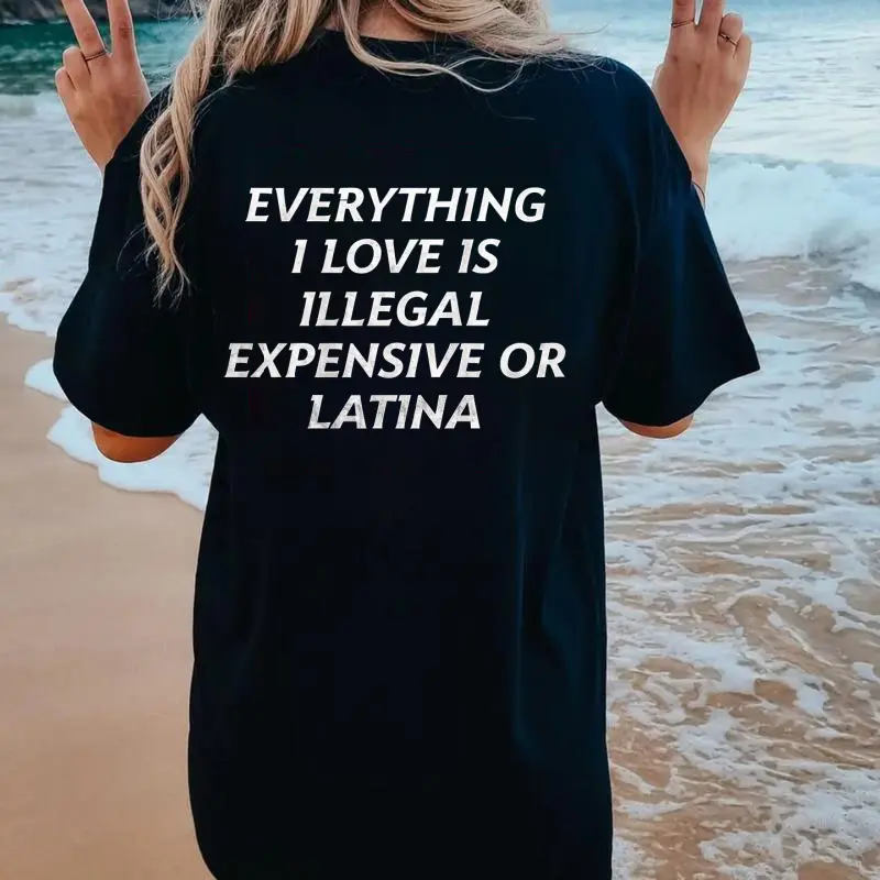 5. Everything I Love Is Illegal, Expensive or Latina T-Shirt, Funny and Bold Graphic Tee, Hilarious Statement Shirt for Men and Women