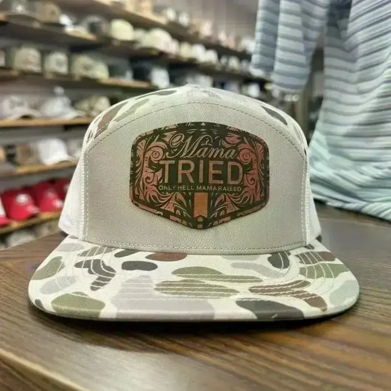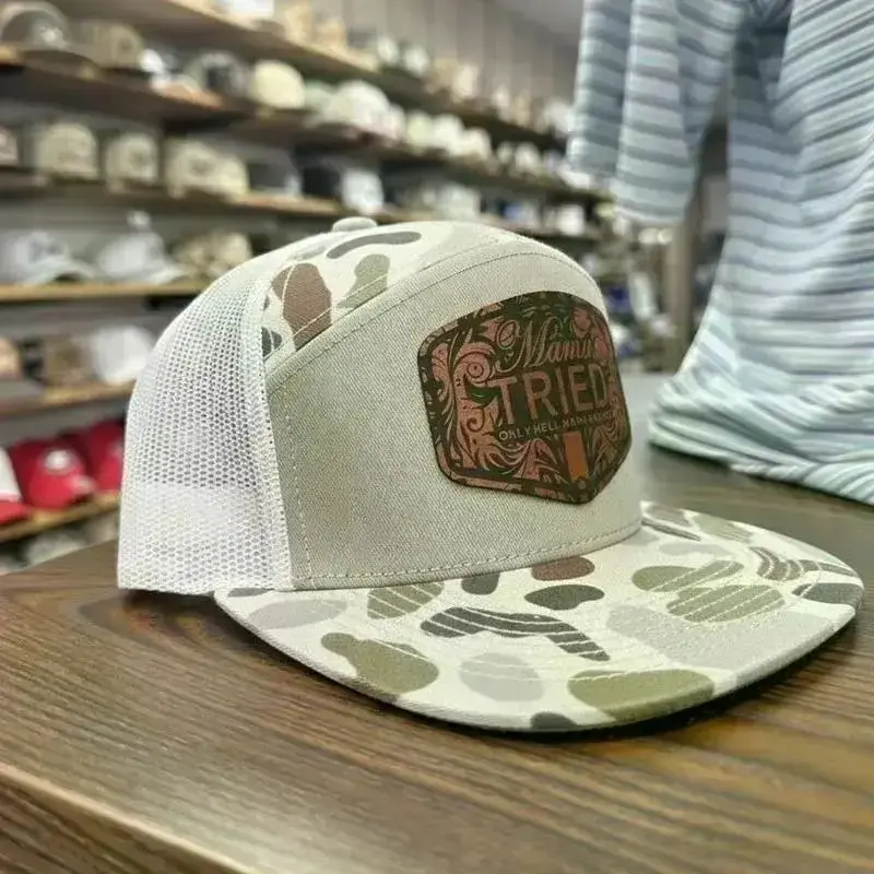 “Mama Tried” Duck Camo Trucker Hat – Premium Leather Patch Flat Bill Snapback, Mother’s Day Gift