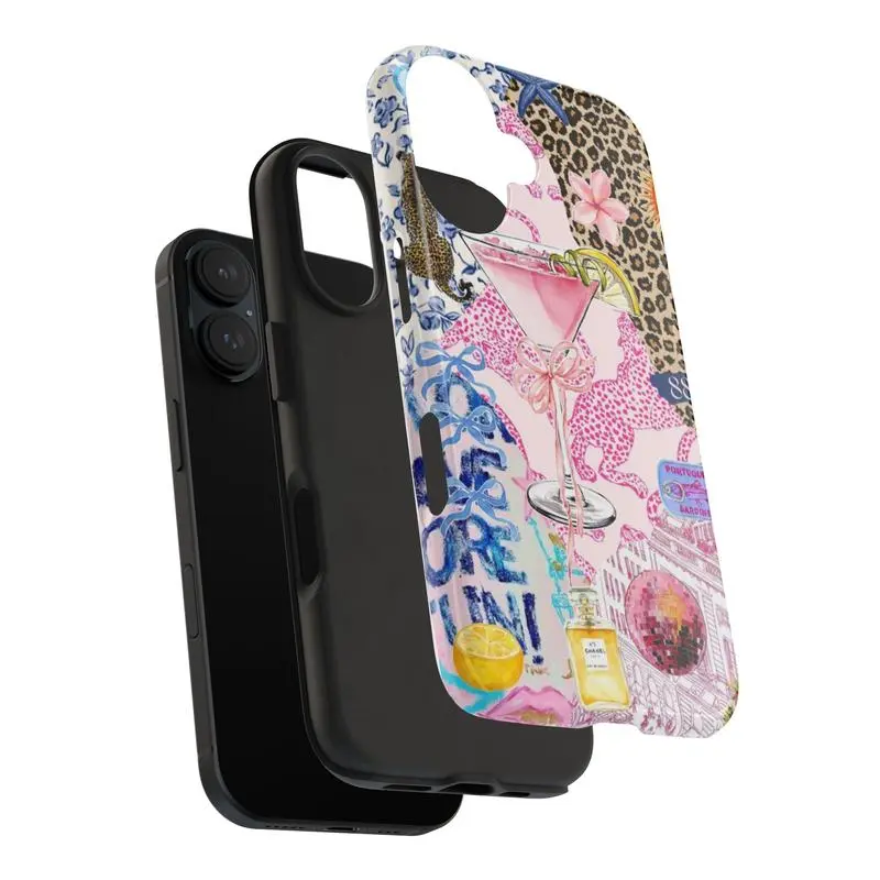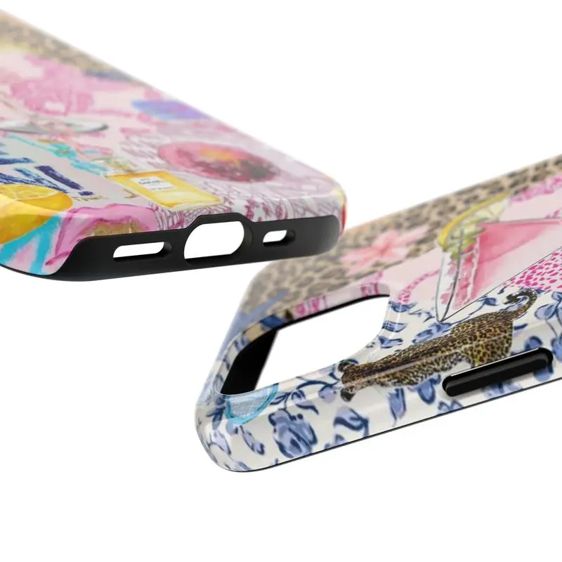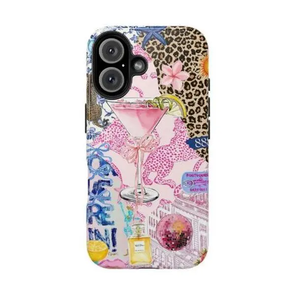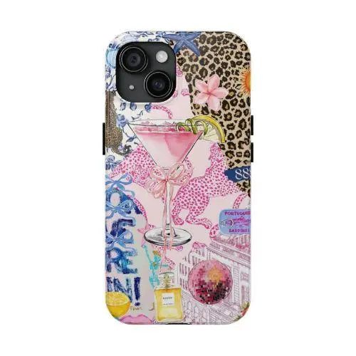 Retro Cocktail Collage Phone Case - Y2K Leopard Print Aesthetic Case - Eclectic Martini Art Phone Case - Pink Martini & Leopard Vibes Phone Cover for iPhone