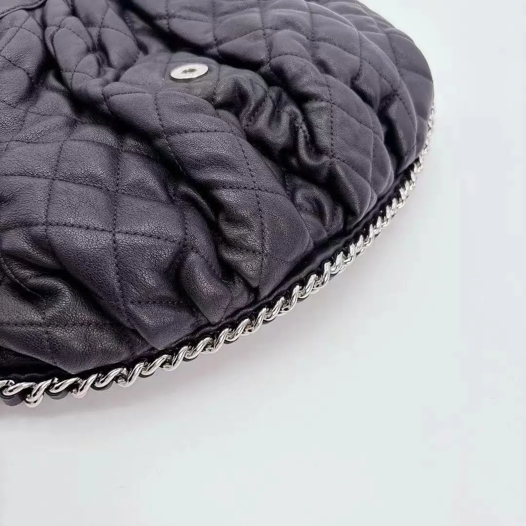 This is an authentic CHANEL Washed Lambskin Quilted Mini Chain Around Flap Black. This chic messenger bag is crafted of luxurious diamond quilted and pleated padded lambskin leather in black. The bag features a leather threaded polished silver chain link crossbody strap and a silver Chanel CC that opens the front half flap with a magnet for quick access. The flap opens to a beige fabric interior with a zipper pocket.