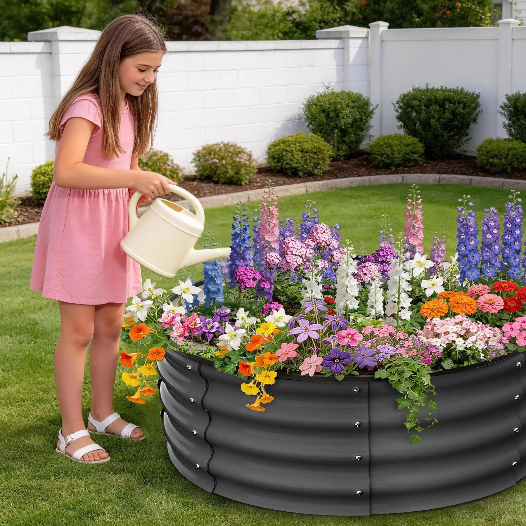 Sturdy & Durable Heavy-Duty Steel Construction: Built from high-grade, heavy-duty steel plates, this round raised garden bed is engineered for long-lasting outdoor use. The upgraded design resists twisting, bending, and corrosion, ensuring your planter box maintains its shape season after season. With a weather-resistant and anti-rust coating, this metal garden bed stands strong against sun, rain, and temperature changes—offering reliable performance for years without fading or structural wear.