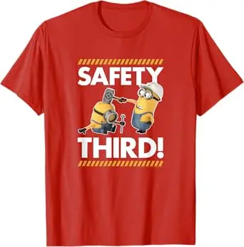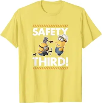 Despicable Me Funny Yellow Creature Tee, Kevin & Stuart Safety Third Funny Graphic T-Shirt #Minions #DespicableMe #FunnyTShirt #CartoonTee #GraphicTee