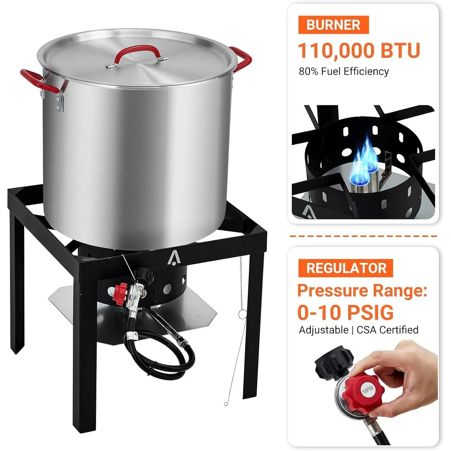 【Powerful 110,000 BTU Propane Burner】Equipped with a high-output cast iron burner delivering up to 110,000 BTUs and a 10 PSI regulator for precise gas flow control, this kit provides rapid, even heating for efficient outdoor cooking and frying.