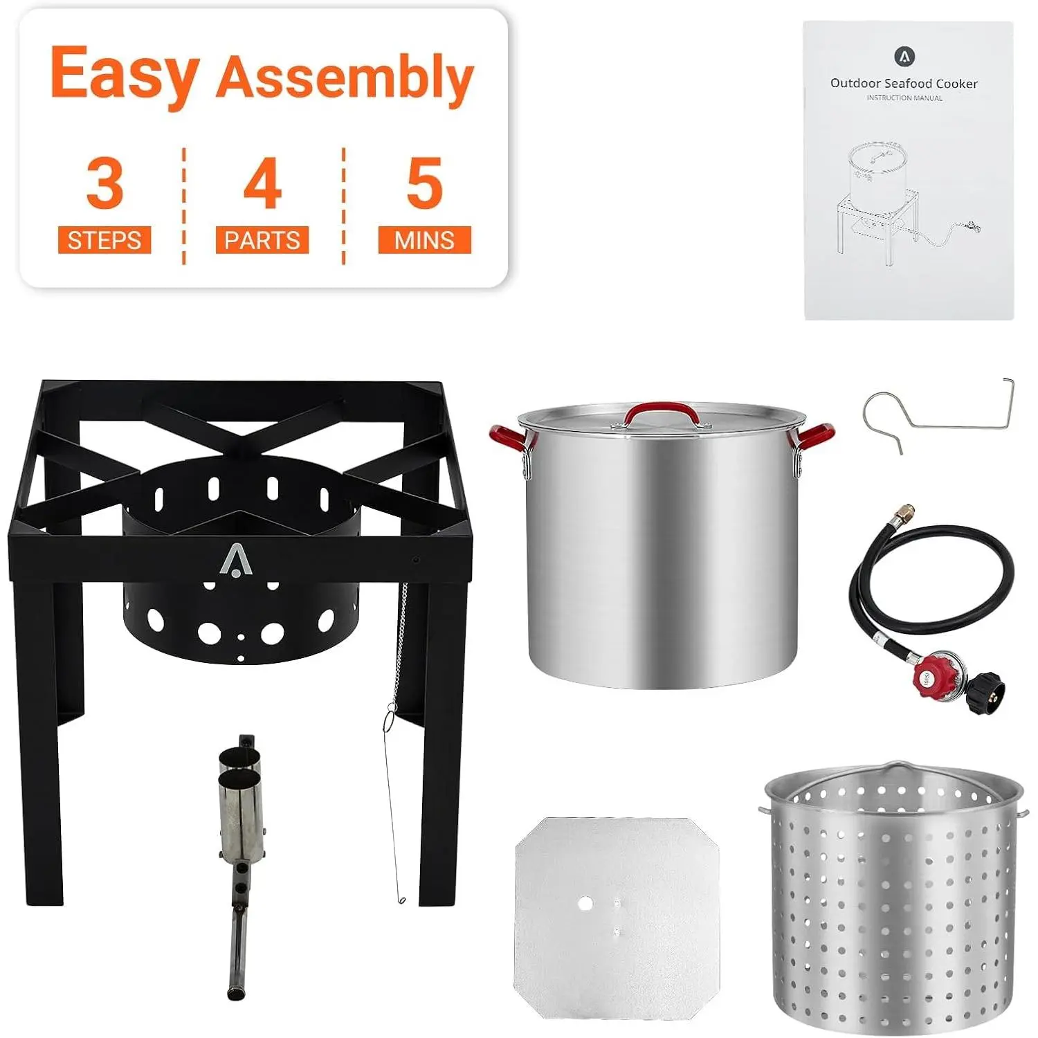【Complete All-in-One Cooking Kit】This comprehensive seafood boil set includes a 60-quart aluminum pot with lid, gas stove burner stand with hose and regulator, support rack, and basket—easy to assemble with clear instructions and all necessary hardware for immediate outdoor cooking enjoyment.
