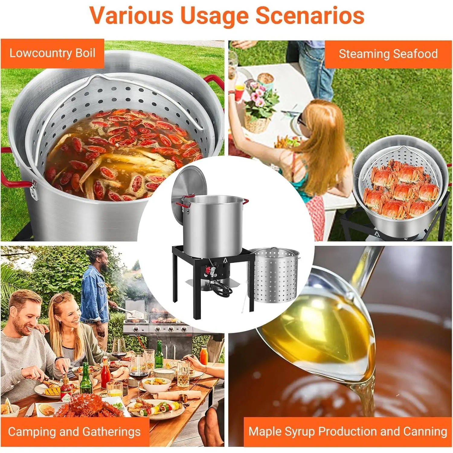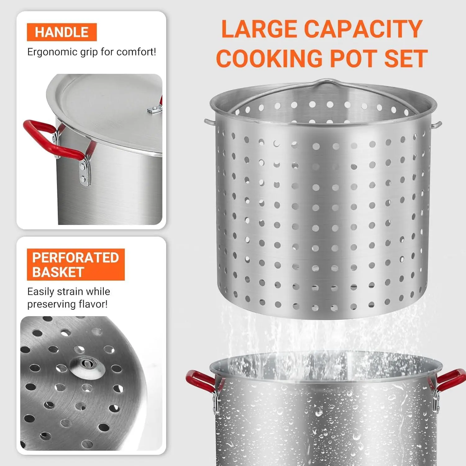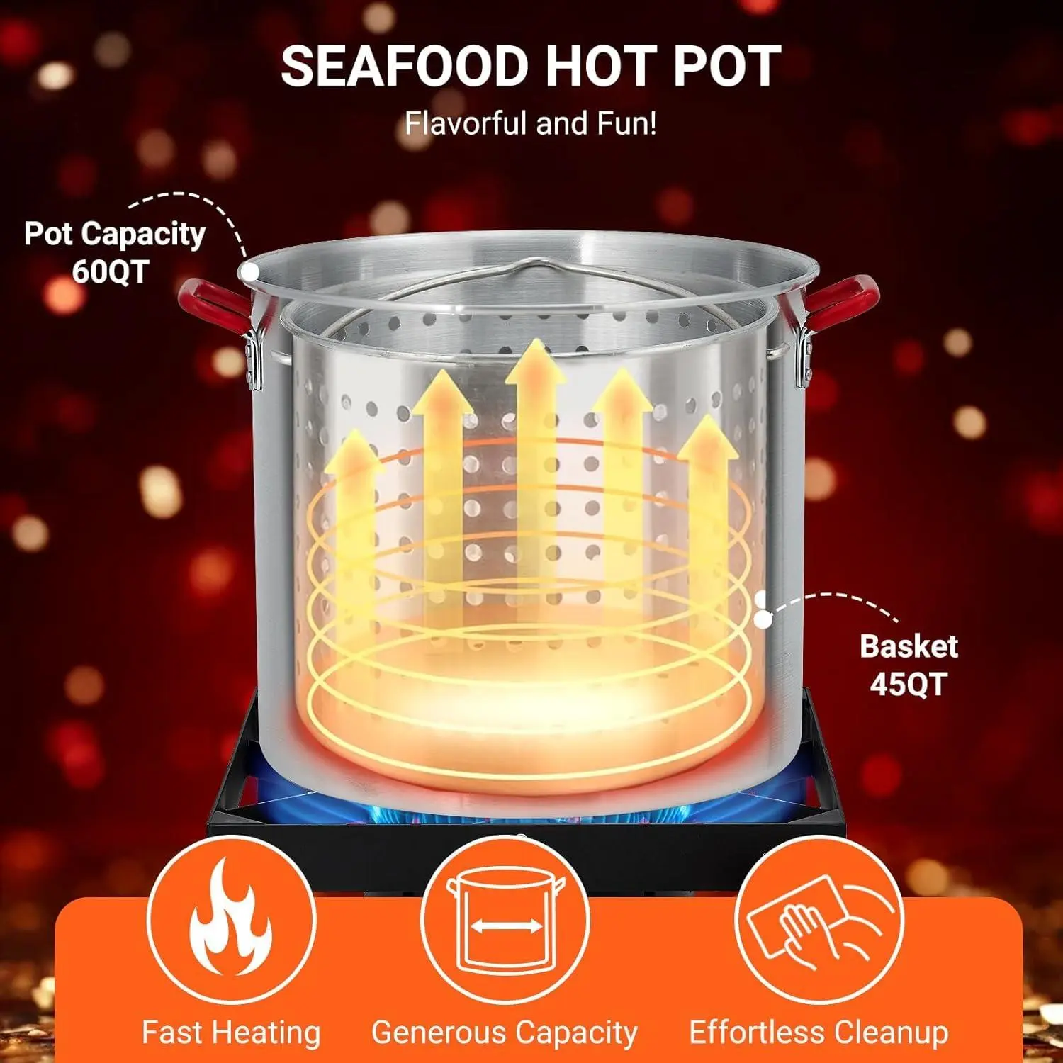 【Large 60-Quart Capacity】This aluminum seafood boil pot offers a generous 60-quart capacity, perfect for steaming and boiling large quantities of crawfish, shrimp, crab, lobster, fish, chicken, and vegetables—ideal for backyard parties, camping trips, and festive gatherings.