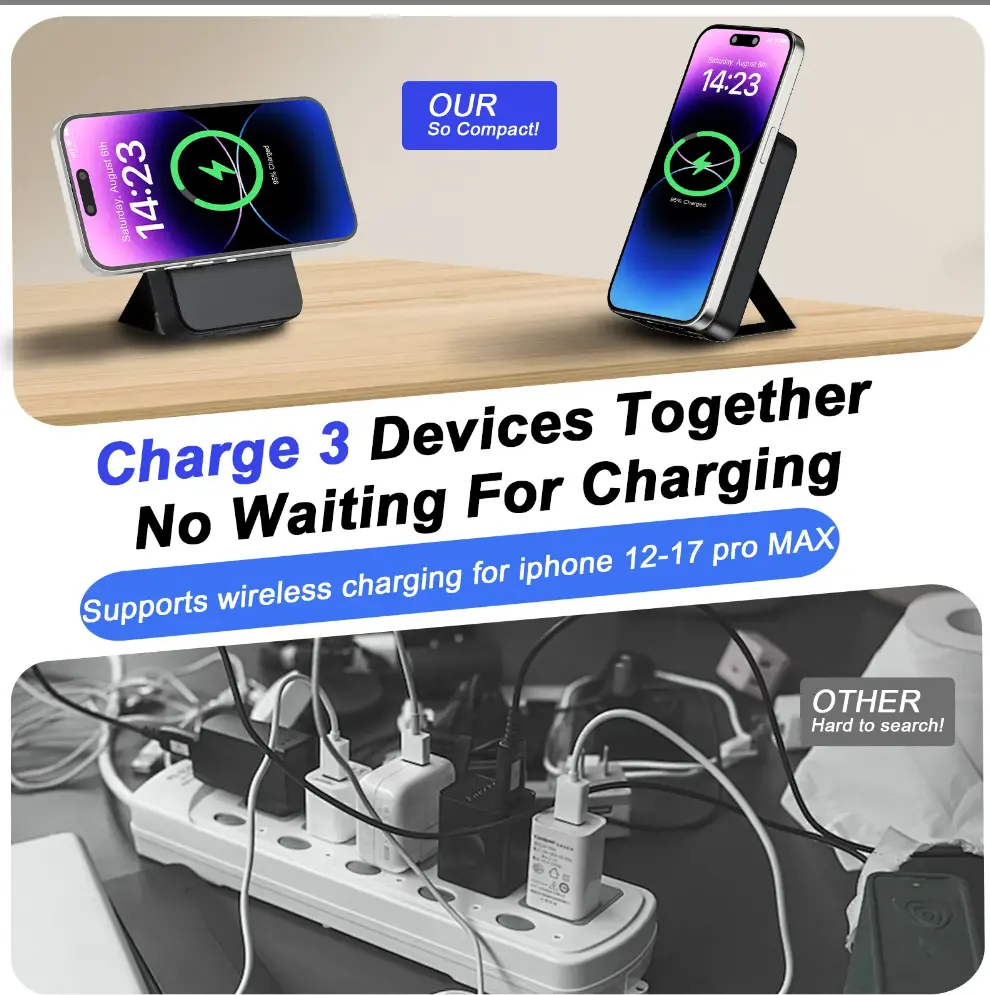 【Simultaneous 3-Device Charging】: Beyond wireless magnetic charging, you can also use the USB-A and USB-C ports to charge your other devices at the same time.