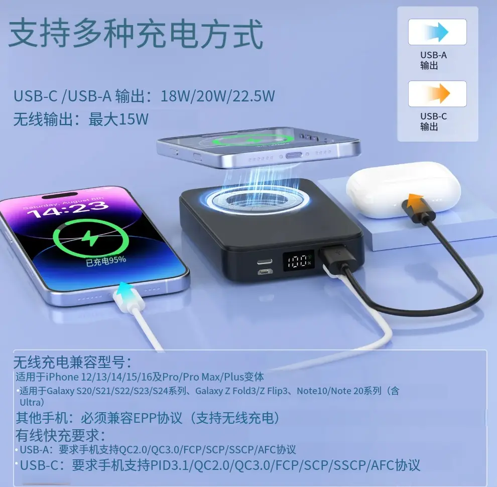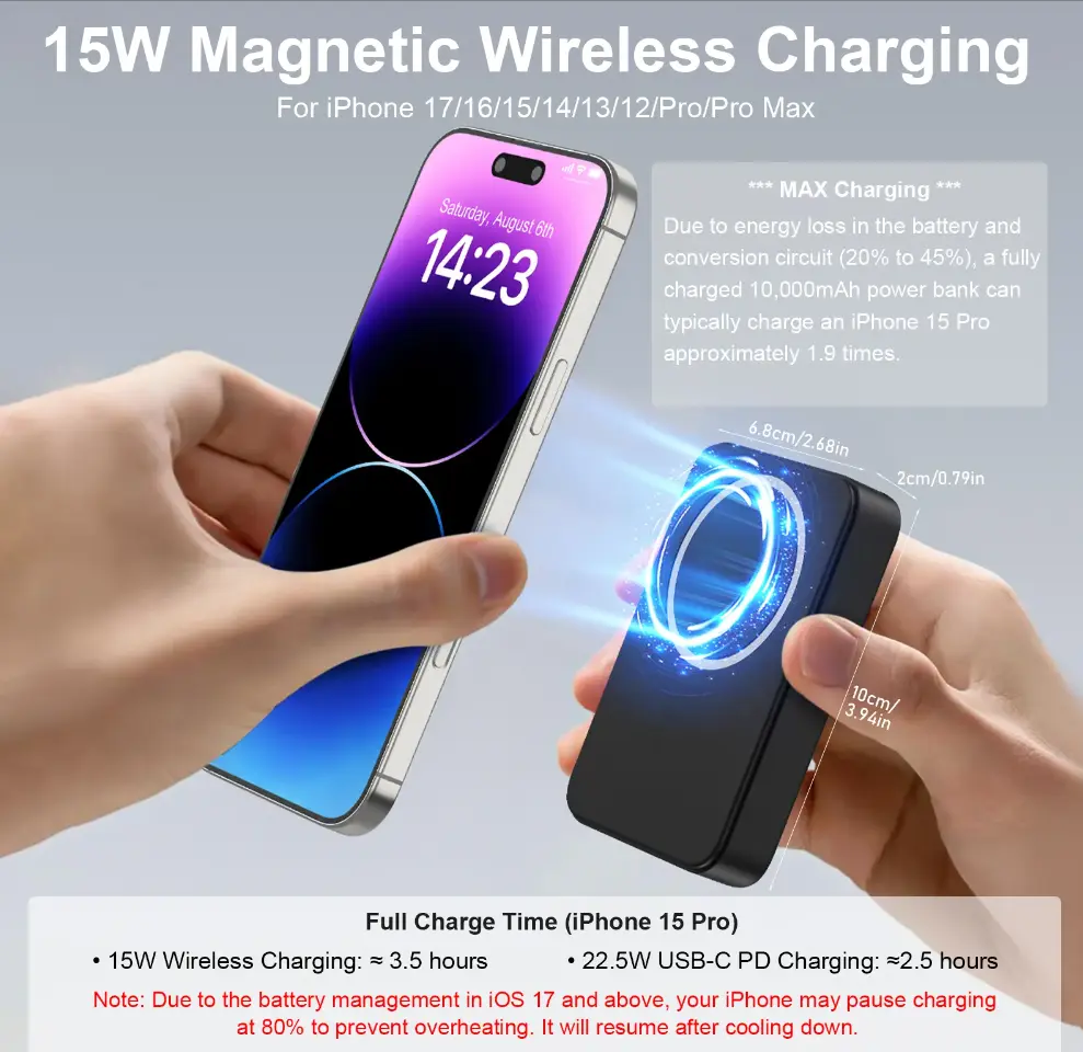 【Magnetic Attachment】: Equipped with a magnetic function, it securely attaches to your phone for effortless charging on the go. (Not for non-magnetic cases)