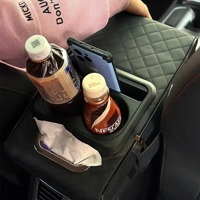 Elevate your car's interior with this versatile 5-in-1 Center Console Cover. It includes 2 storage bags, a cup holder, a tissue box slot, and a phone slot. Perfect for sedans, this organizer keeps your essentials within reach. The scratch-resistant grid design ensures durability. Ideal for family trips, it's a must-have for any car. Universal fit for various car models.