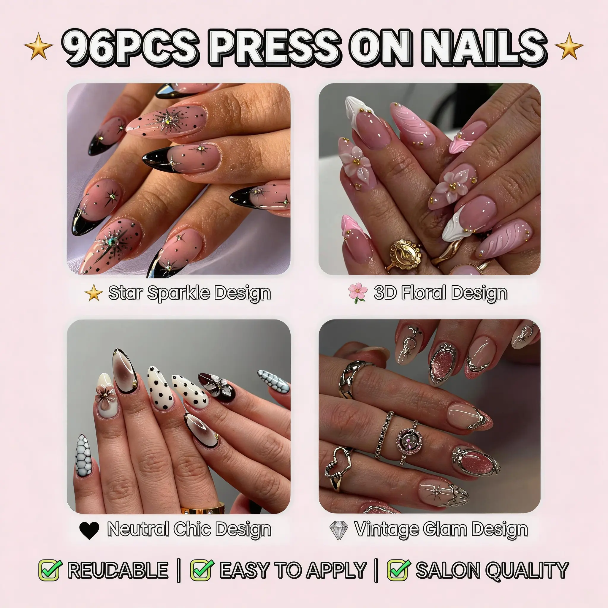 (4 exclusive styles * 24pcs each) with iconic, on-trend designs to match every vibe: