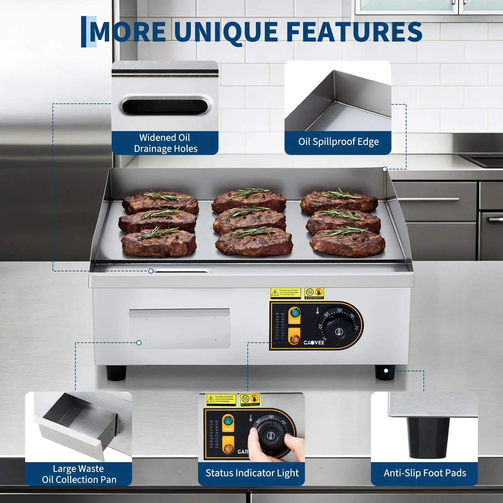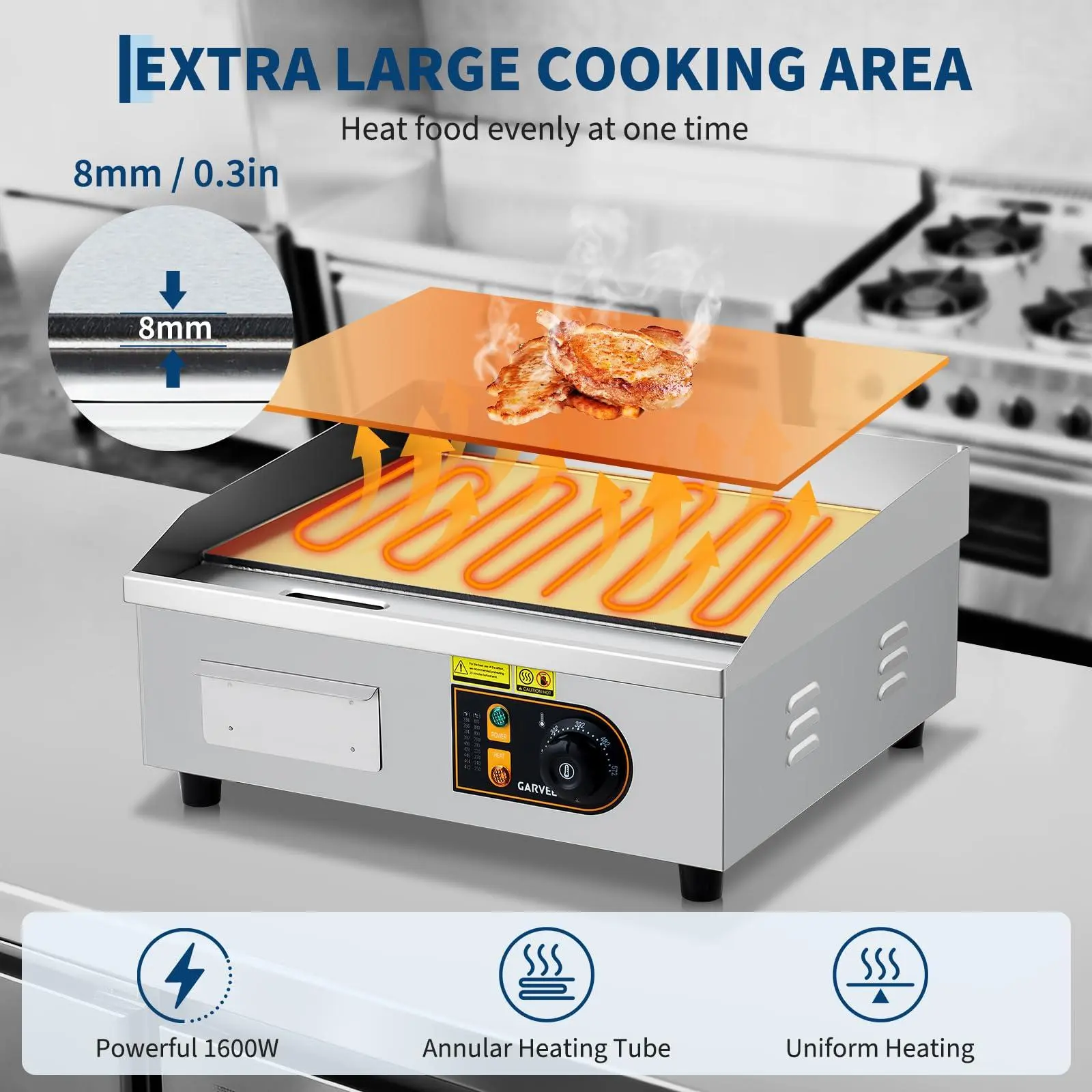 【Stainless Steel Construction】- The 410 stainless steel housing offers resistance to corrosion and grease buildup in demanding kitchen environments. This stainless steel griddle electric is designed to maintain its professional appearance with regular use in food service settings.