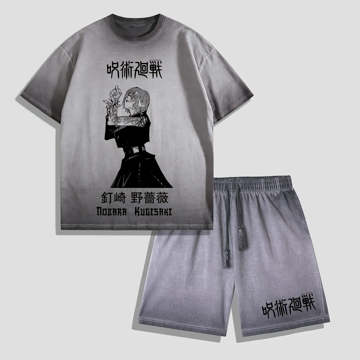 Grunge Jujutsu Kaisen Dirty Wash Grey Matching Set Short Sleeve & Shorts Outfit