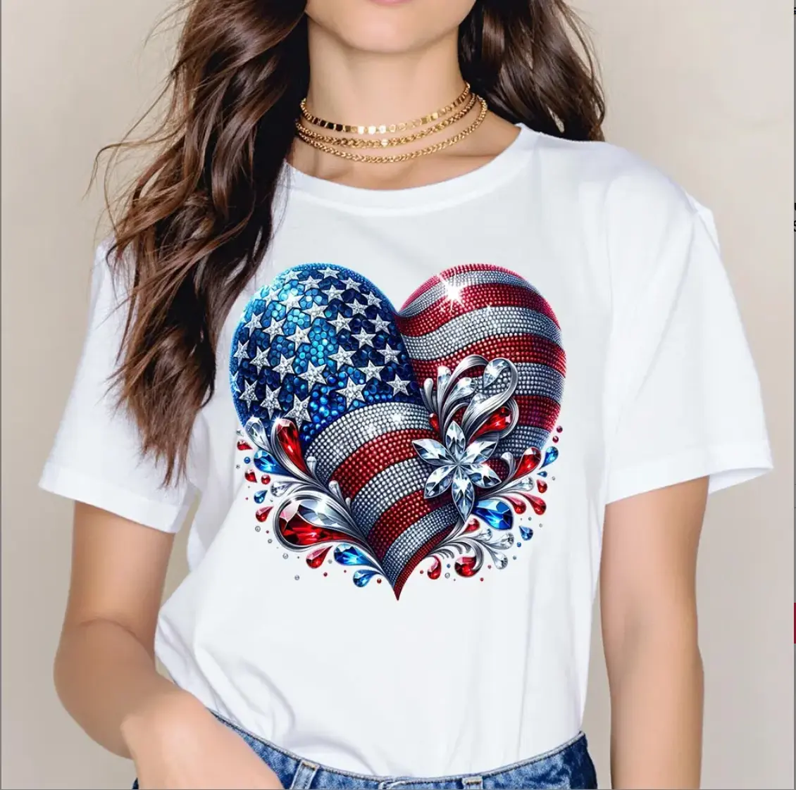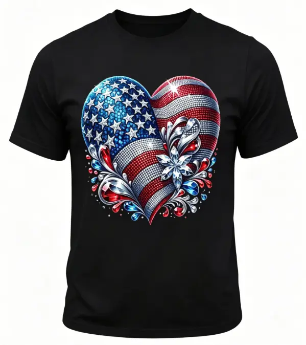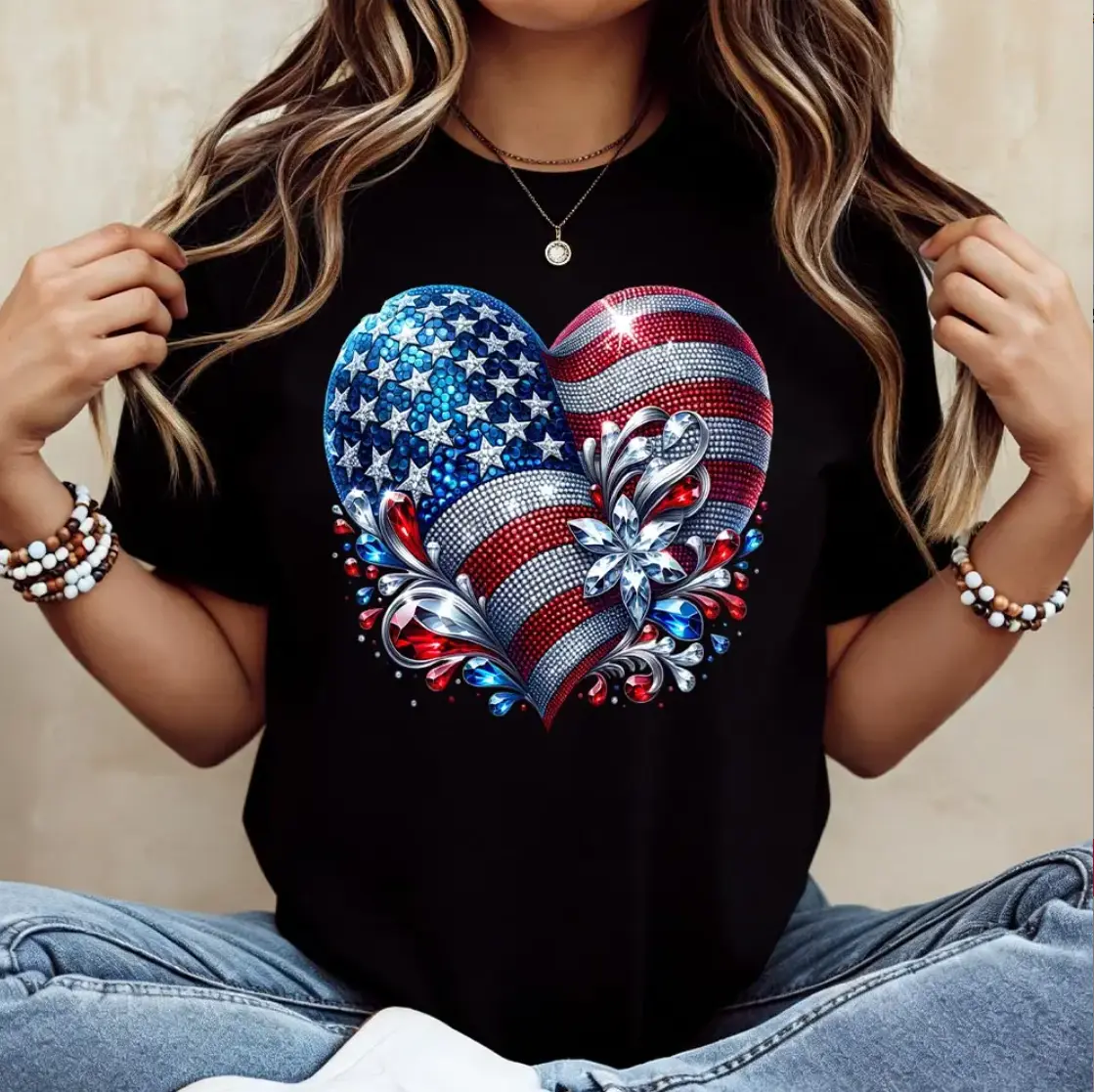 5. American Flag Heart Design Cotton Casual Crew Neck Short Sleeve Regular Sleeve Summer T-Shirt Machine Washable Not Dry Clean Made In USA