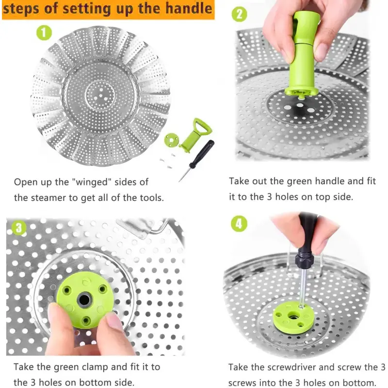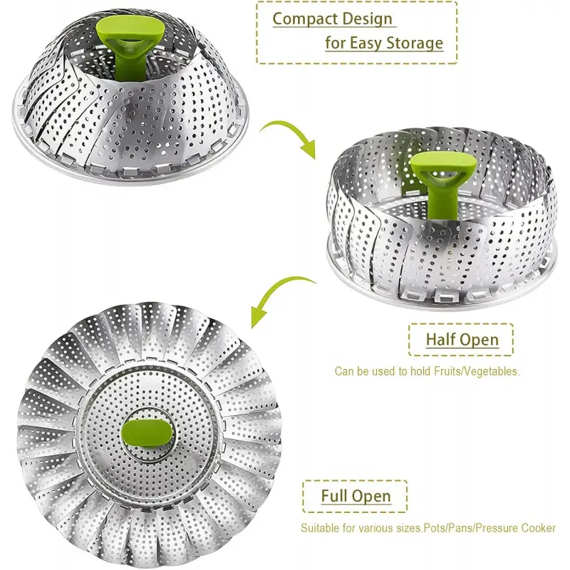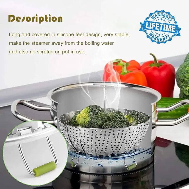The steamer basket with high quality stainless steel petals, food grade plastic handle and silicone feet will guarantee your health.Steaming is a healthy cooking choice because it helps retain more than 90% of the nutrients lost when either boiling or microwaving food.The foldable steamer basket can be used to steam veggies, seafood, eggs, meats, desserts and much more.