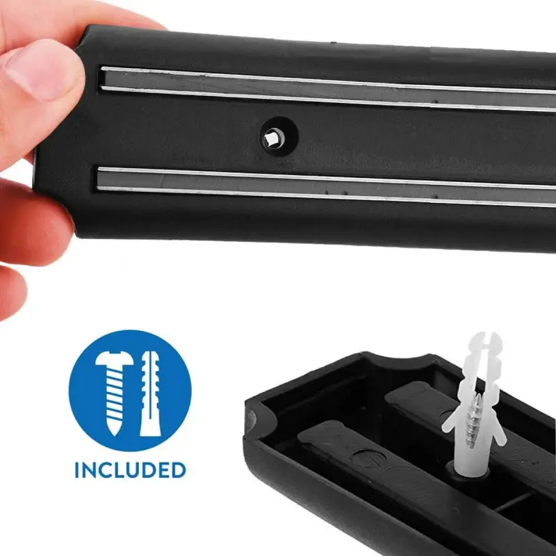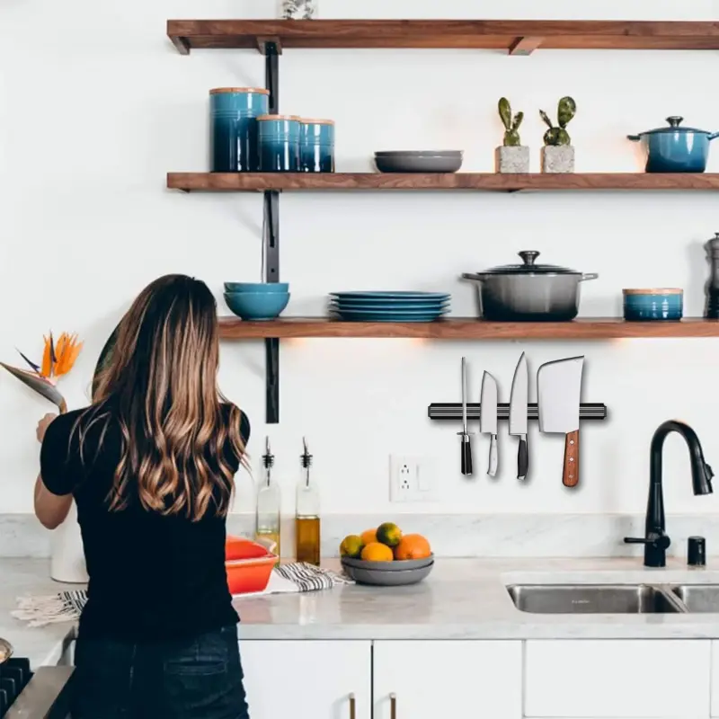 the powerful magetic strip can hold securely your knifes, We only use the strongest neodymium magnets And prevent young children won't have access to your sharp knives