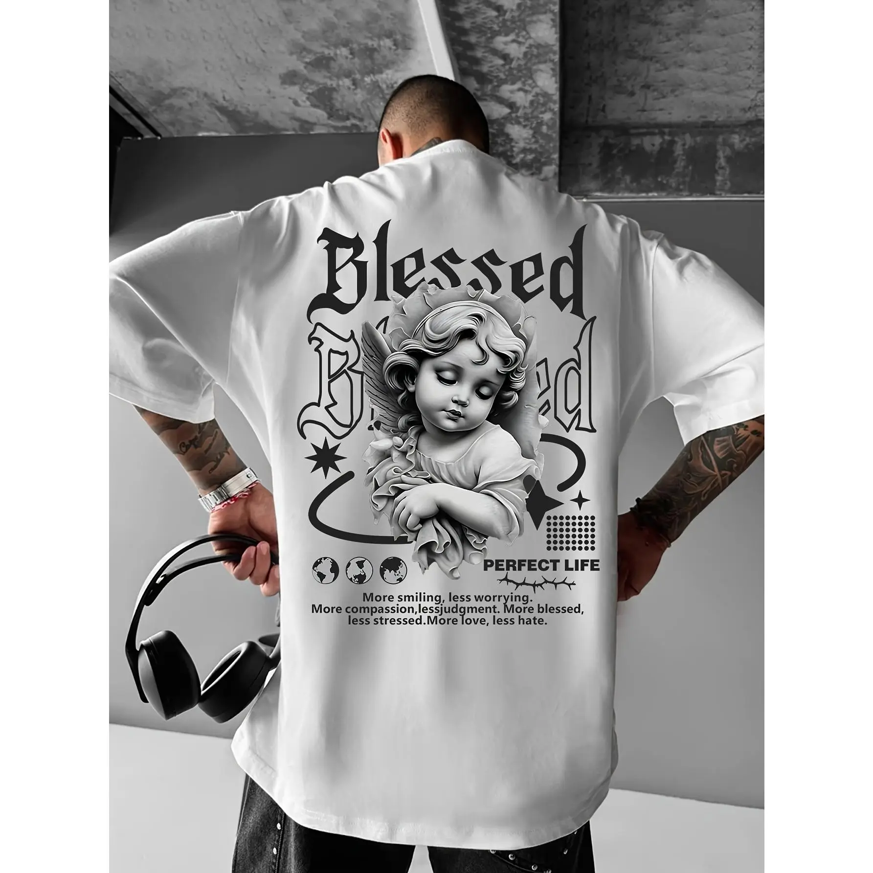 Black Cotton Men's T-Shirt 180g Pure Cotton Men's Sport Casual Blessed Angel Design With Inspirational Quotes Perfect Life Message For Everyday Wear And Gift For Loved Ones Friends Or Family Members Who Appreciate Faith And Positivity