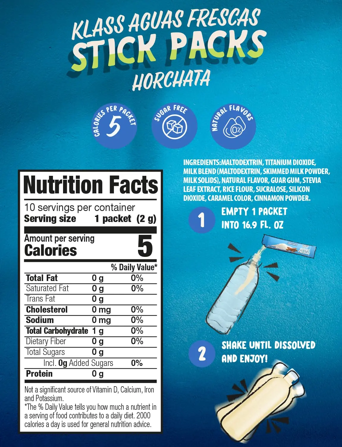 ·VARIETY OF FLAVORS: Add some variety to your everyday party with this re-sealable pack containing 40 servings of Klass Aguas Frescas Stick Packs. Our Pack is filled with 40 stick packets of each flavor. Horchata, Passionfruit, Mango, Watermelon and Pineapple.