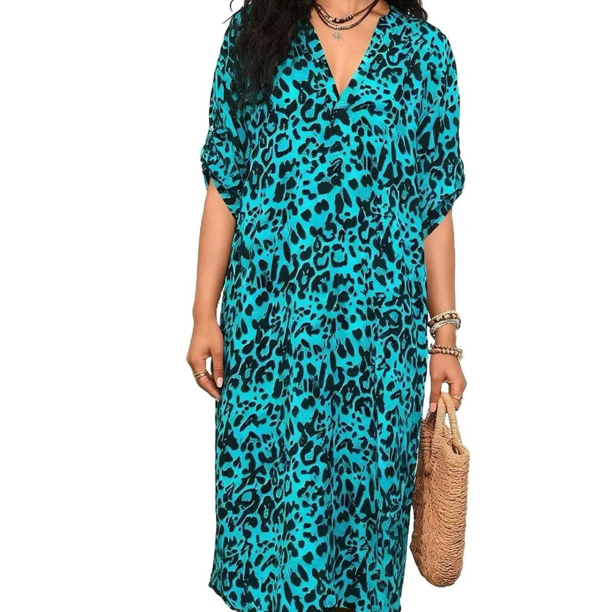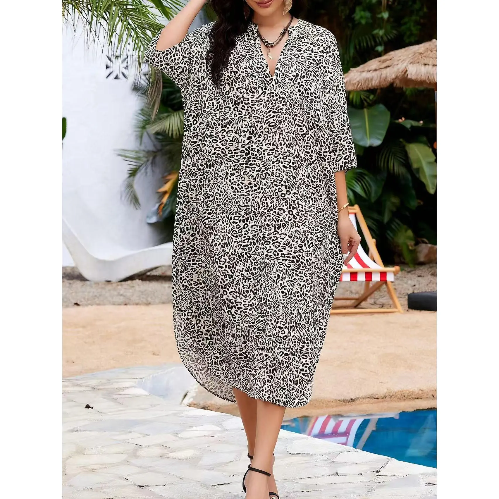 Women's swimsuit cover-up, stand-up collar leopard print robe, beach vacation long dress, loose bikini swimsuit cover-up for women
