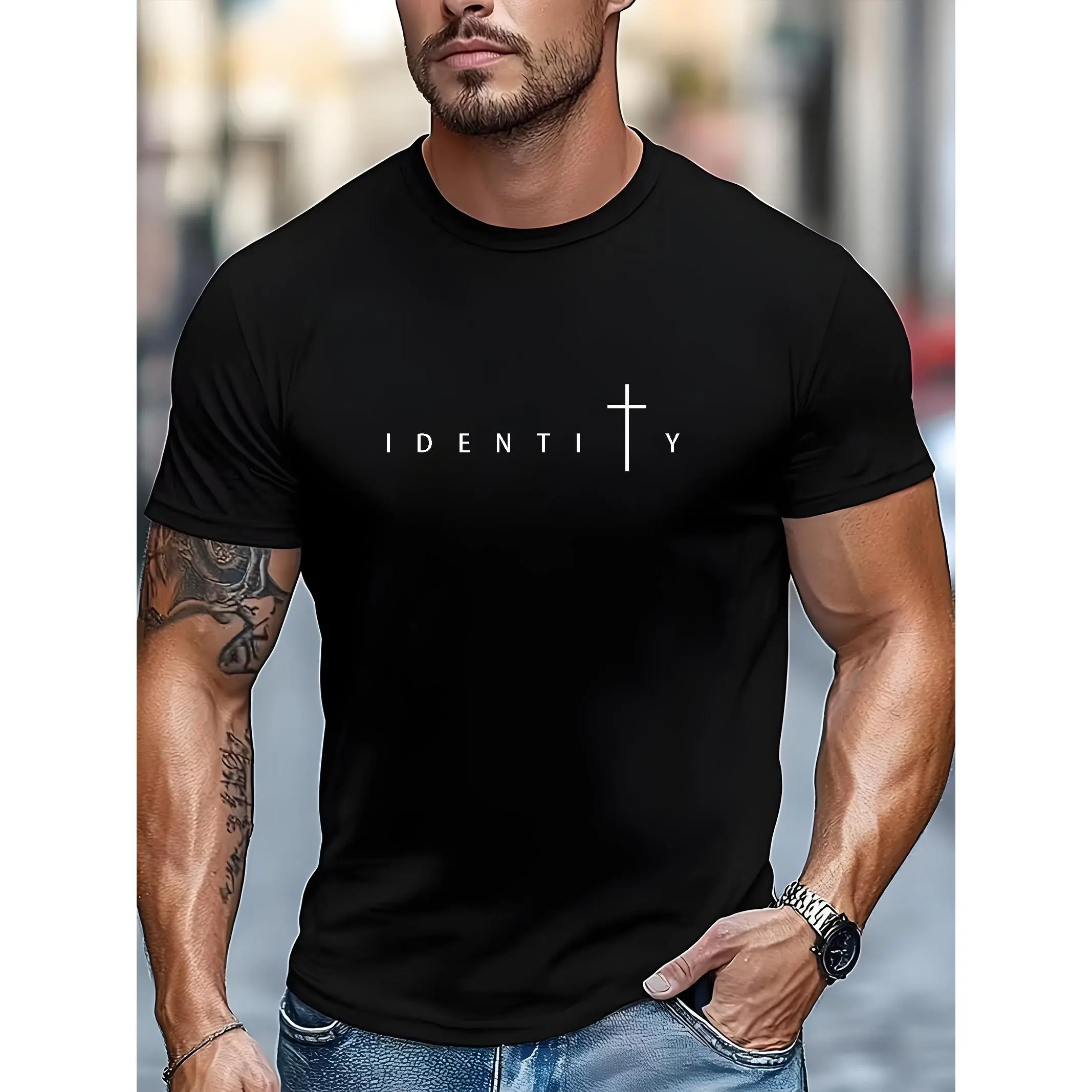Men's Outdoor Casual Sports T-Shirt - Soft Crew Neck Casual Pullover with White Christian Cross and ID Text, Minimalist Religious Statement Sweater Suitable for Daily Wear, Comfortable Layering Essential, Machine Washable - Versatile
