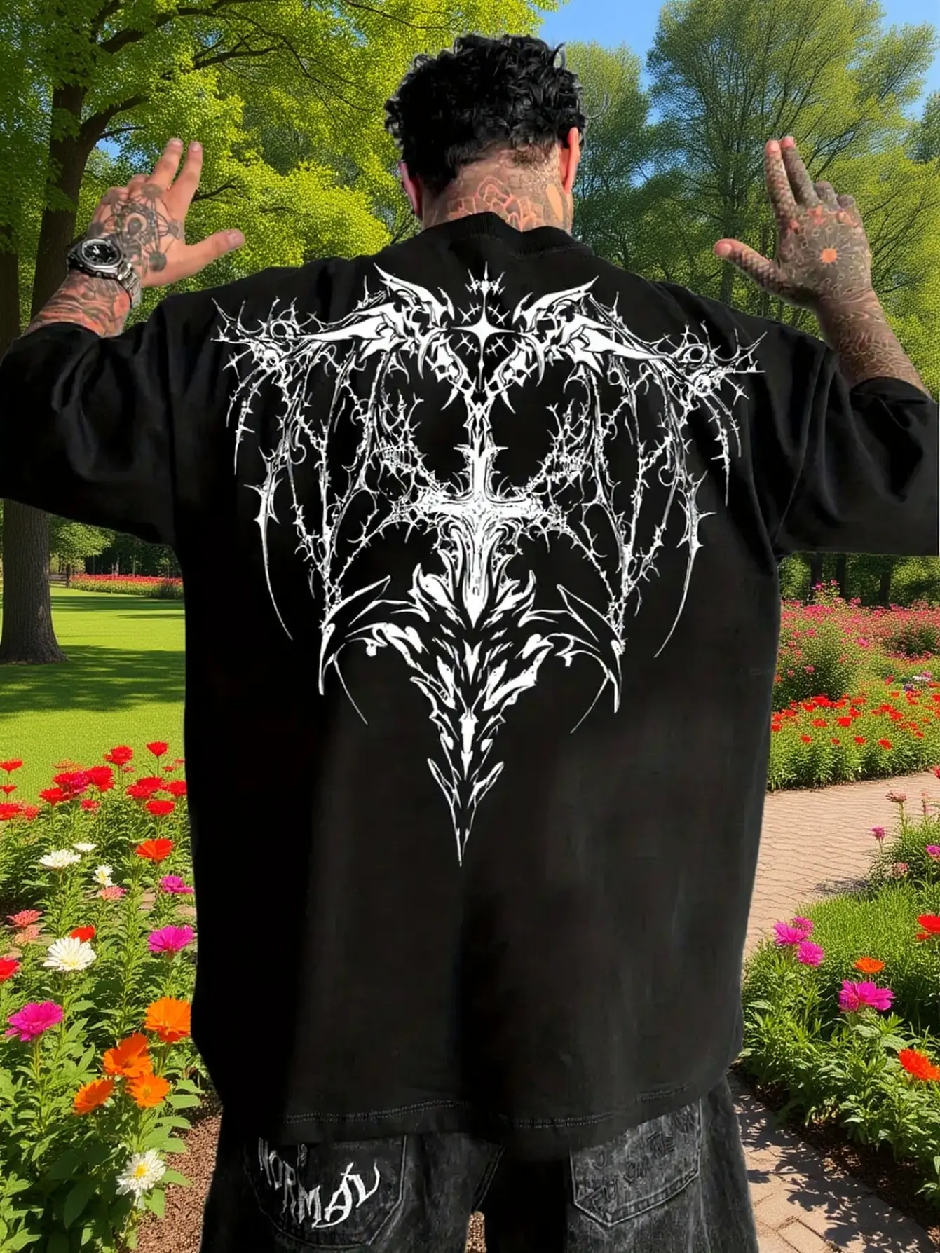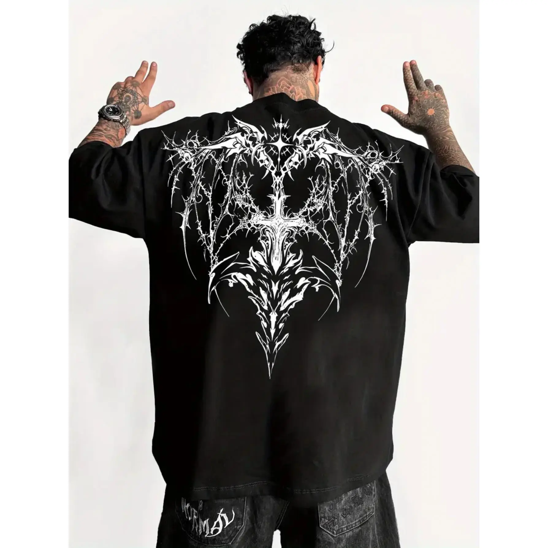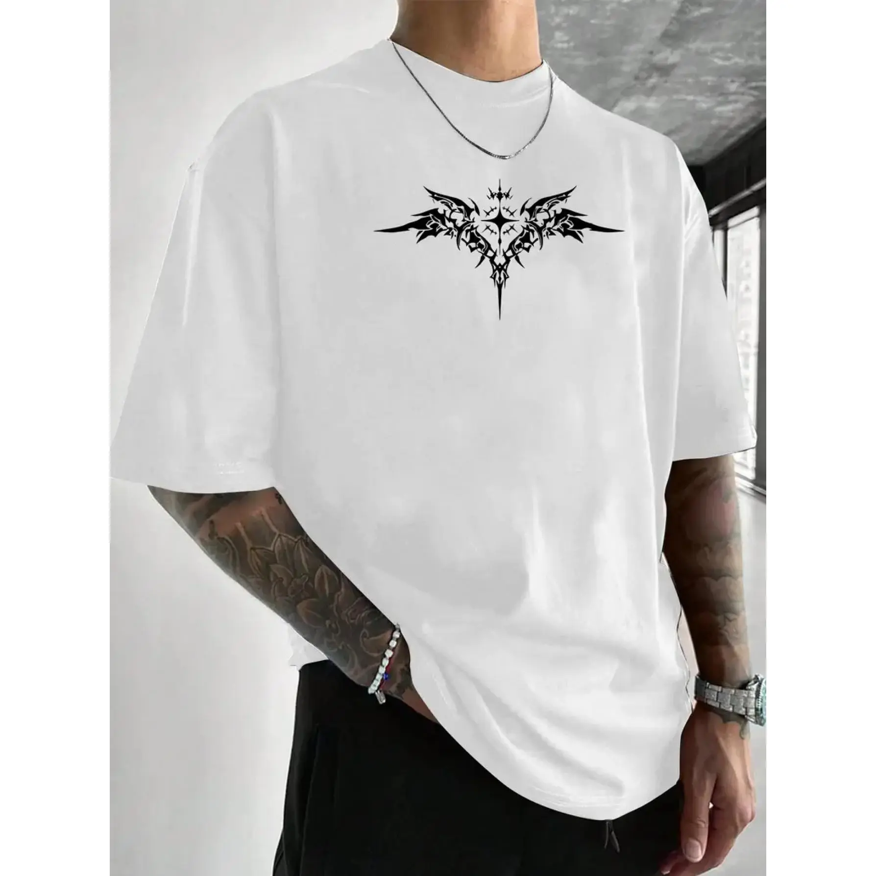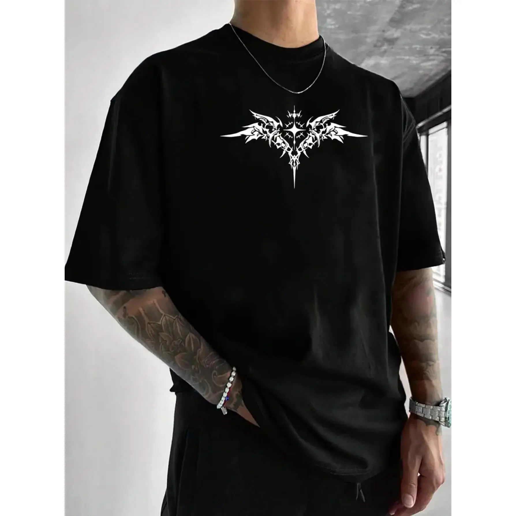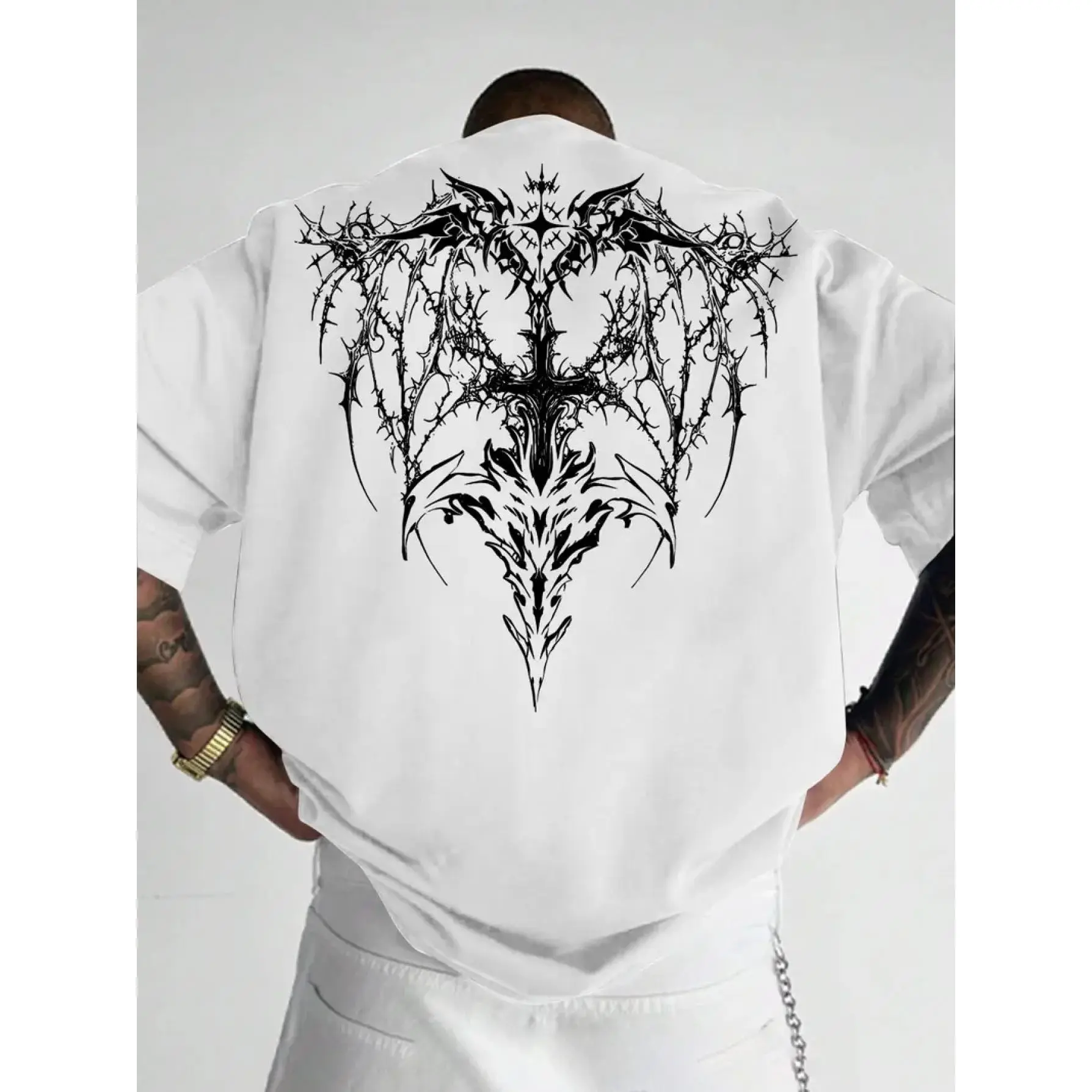Men'S Gothic Dark Pattern T-Shirt Featuring Black And White Bat Wings And a Print Barbed Wire Design on The Back - an Ideal Choice for Gothic Fashion Enthusiasts with Intricate Wings And Thorn Designs