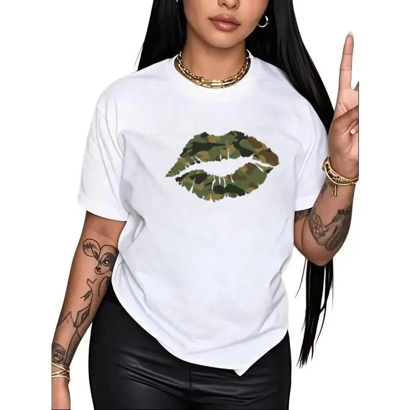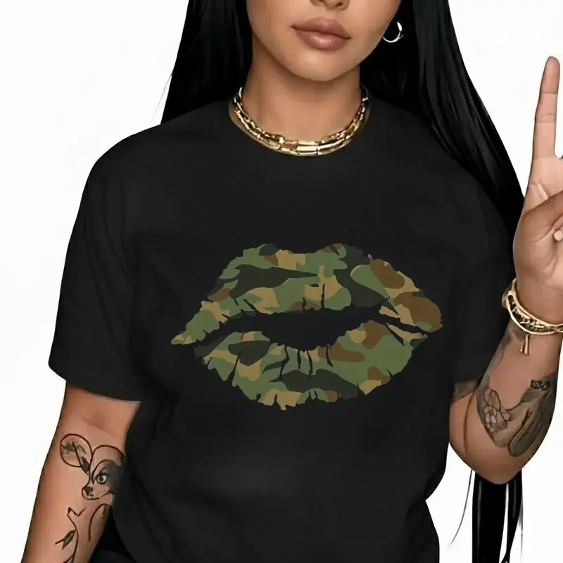 Women's Camo Lip Print T-Shirt, Soft Knit, Breathable & Machine Washable, Casual Round Neck Short Sleeve Top for All Seasons | Bold Camouflage Design, Black with Green & Brown Accents