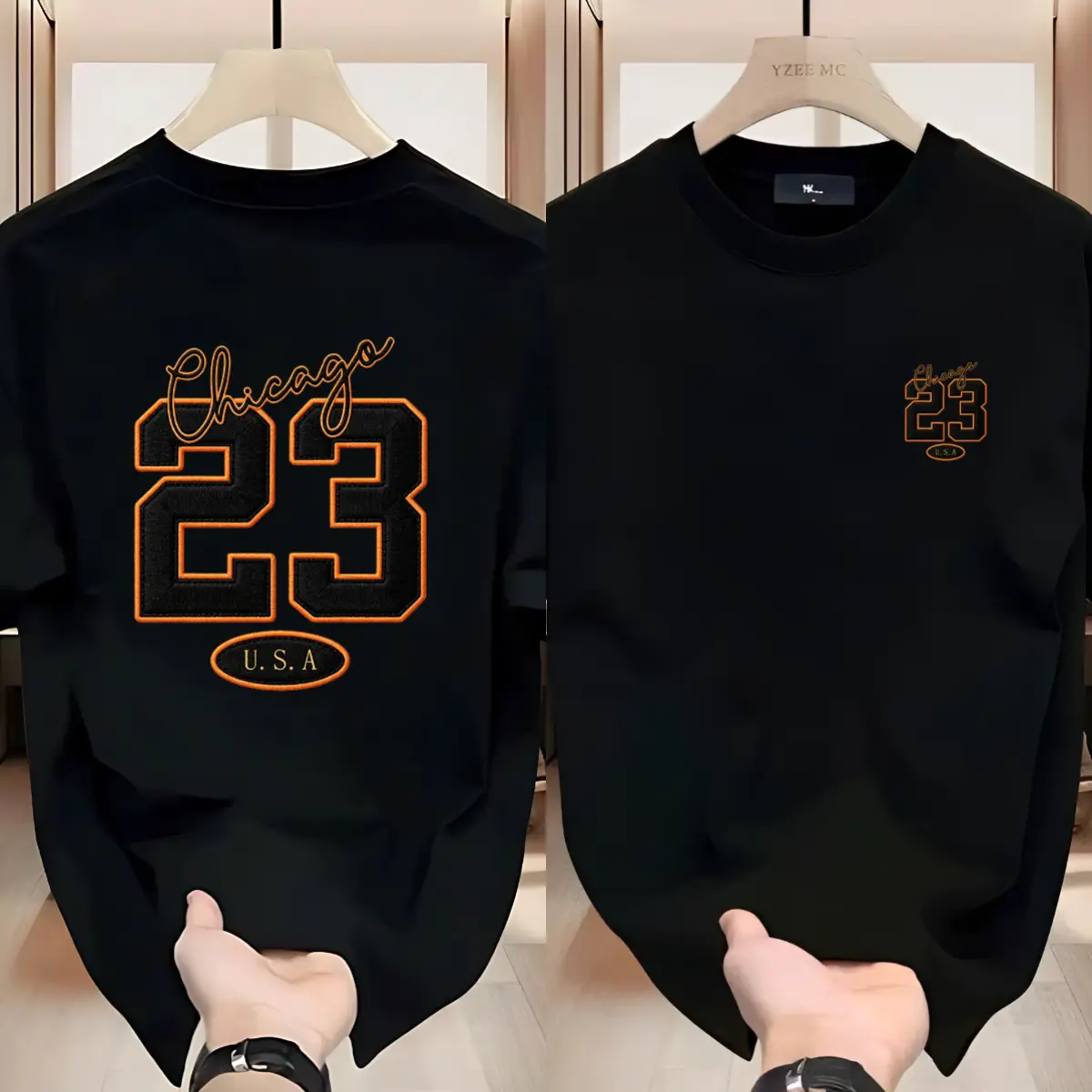 This unisex Chicago 23 t-shirt features simulated embroidery & realistic print on the front, blending textured detail with a clean, modern look. Made from soft premium cotton, it has a classic crew neck and short sleeves, offering excellent breathability, skin-friendliness, and all-day comfort. Machine washable and durable, its made for everyday casual wear and light sports.