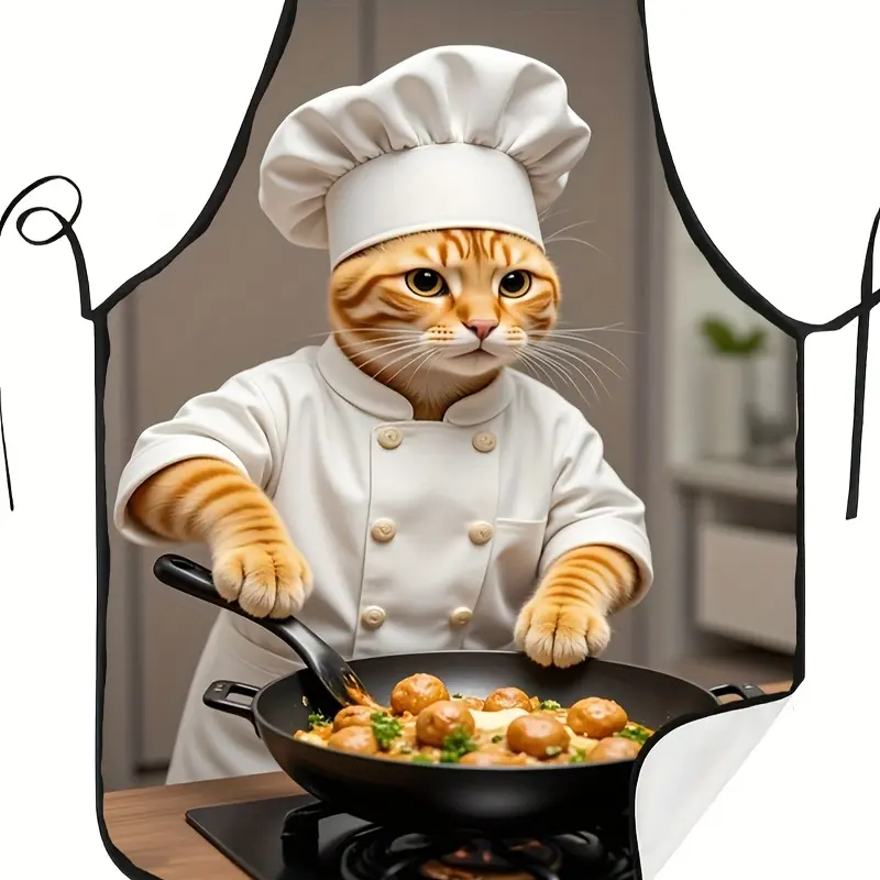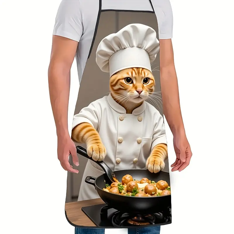 Men'S Polyester Apron | Cartoon Chef Cat Design | Adjustable Neck Strap | Non-Stretch Fabric | All-Season Kitchen Wear | Durable & Easy to Care | Ideal for Cooking Enthusiasts | Playful Kitchen Accessory | Sturdy Apron