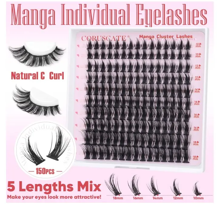 ·Manga Lash Clusters: DIY Lash extension contains 150 pieces of individual eyelashes cluster on this tray, eyelash clusters ranging from 10mm to 18mm, and it has naturally C curl, apply them at home and get a wispy anime look, making your eyes look more attractive