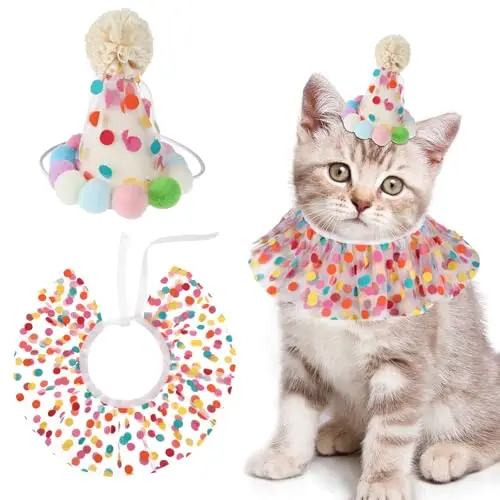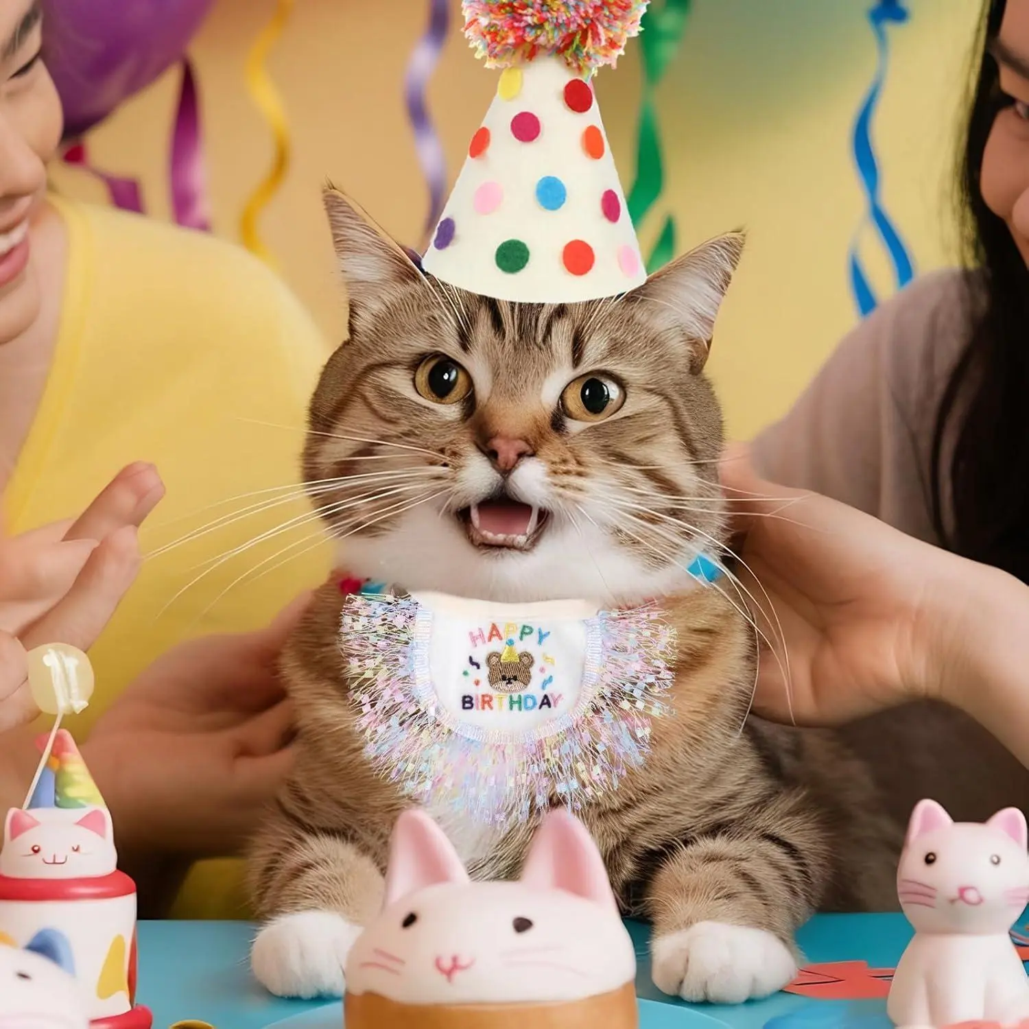 Cat Birthday Hat and Bandana Scarf, Cat Birthday Outfit Party Hat Dog Costumes Cute Lace Puppy Bib Scarf Party Decorations Set for Small Medium Cats & Doggy
