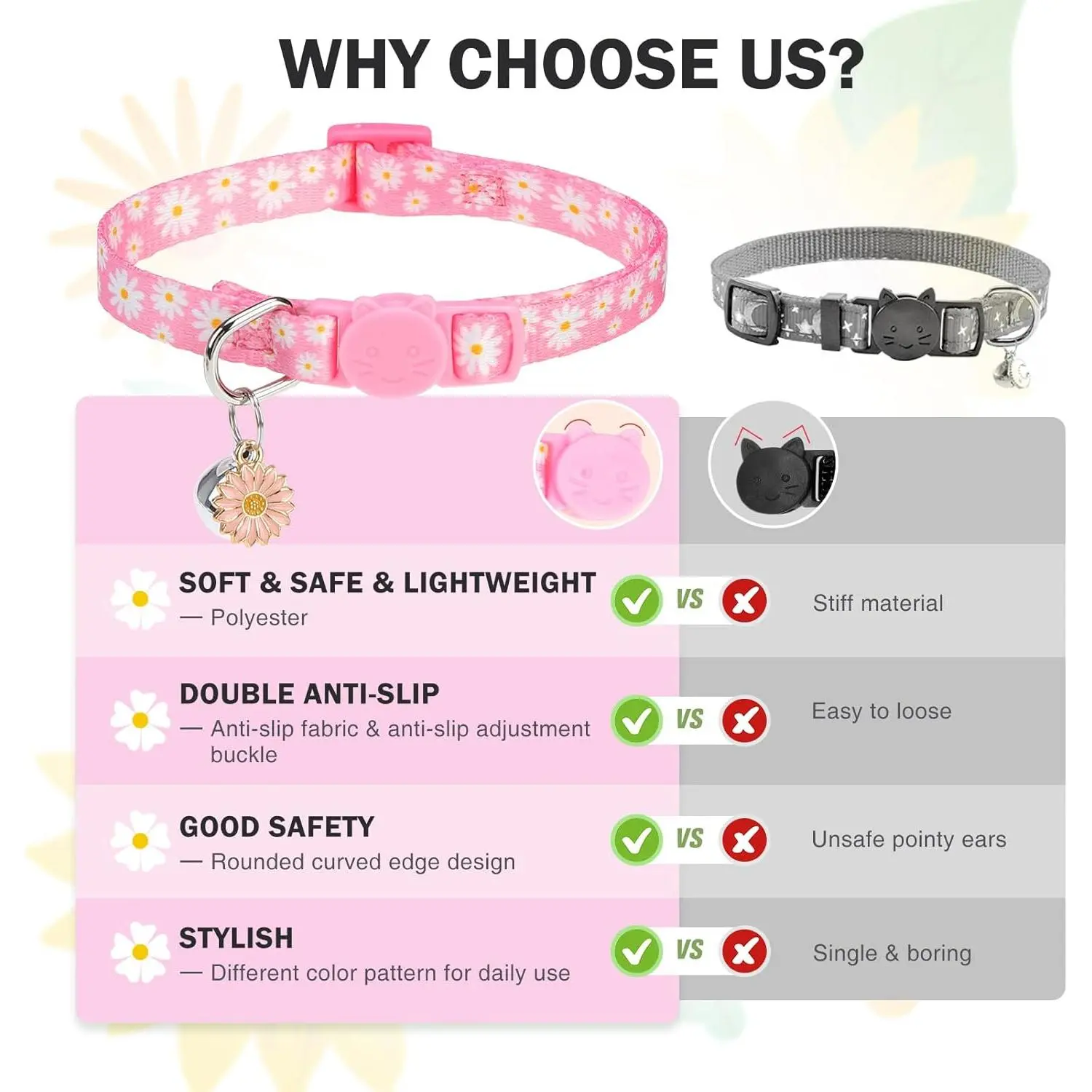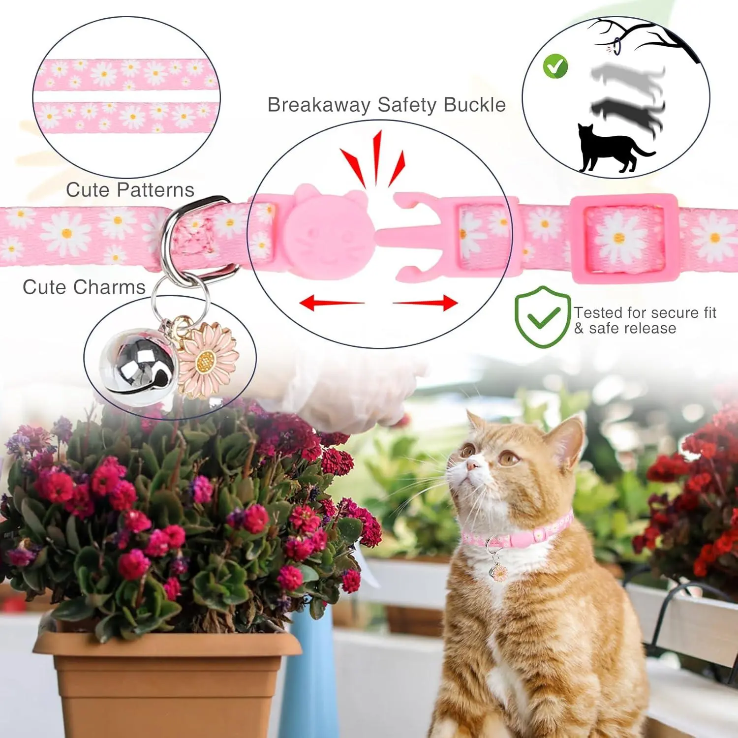 Cat Collars for Girl Cats, 3 Pack Spring Flower Cat Collars Breakaway with Bell for Outdoor Indoor Kitten, Cute Collar with Safety Buckle Adjustable 8"-12" for Kitty Puppy Small Pets, Floral