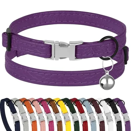 Leather Cat Collar with Buckle and Removable Bell - Non Breakaway Adjustable Soft Safety Small Pet Collars for Girl Boy Cats Kitten (Purple)