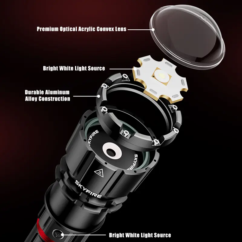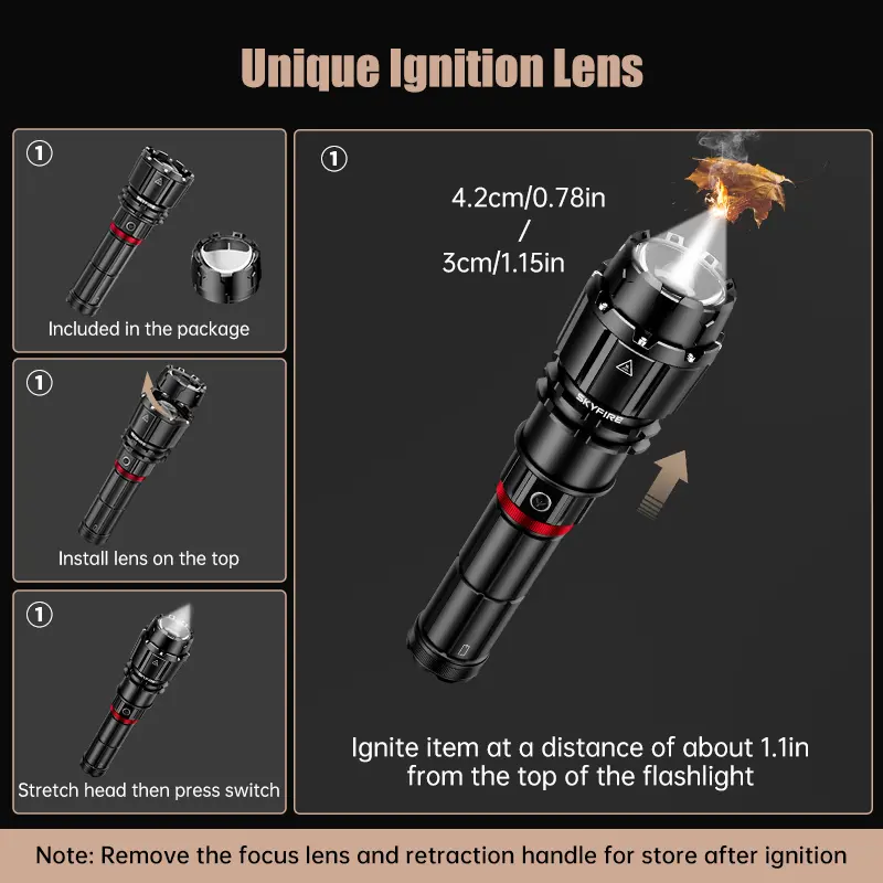 This Skyfire 1209 Ultra flashlight features a patented ignition lens for easy fire starting, ideal for outdoor adventures, survival and emergencies. It works for lighting, cooking, campfires, home and work use.