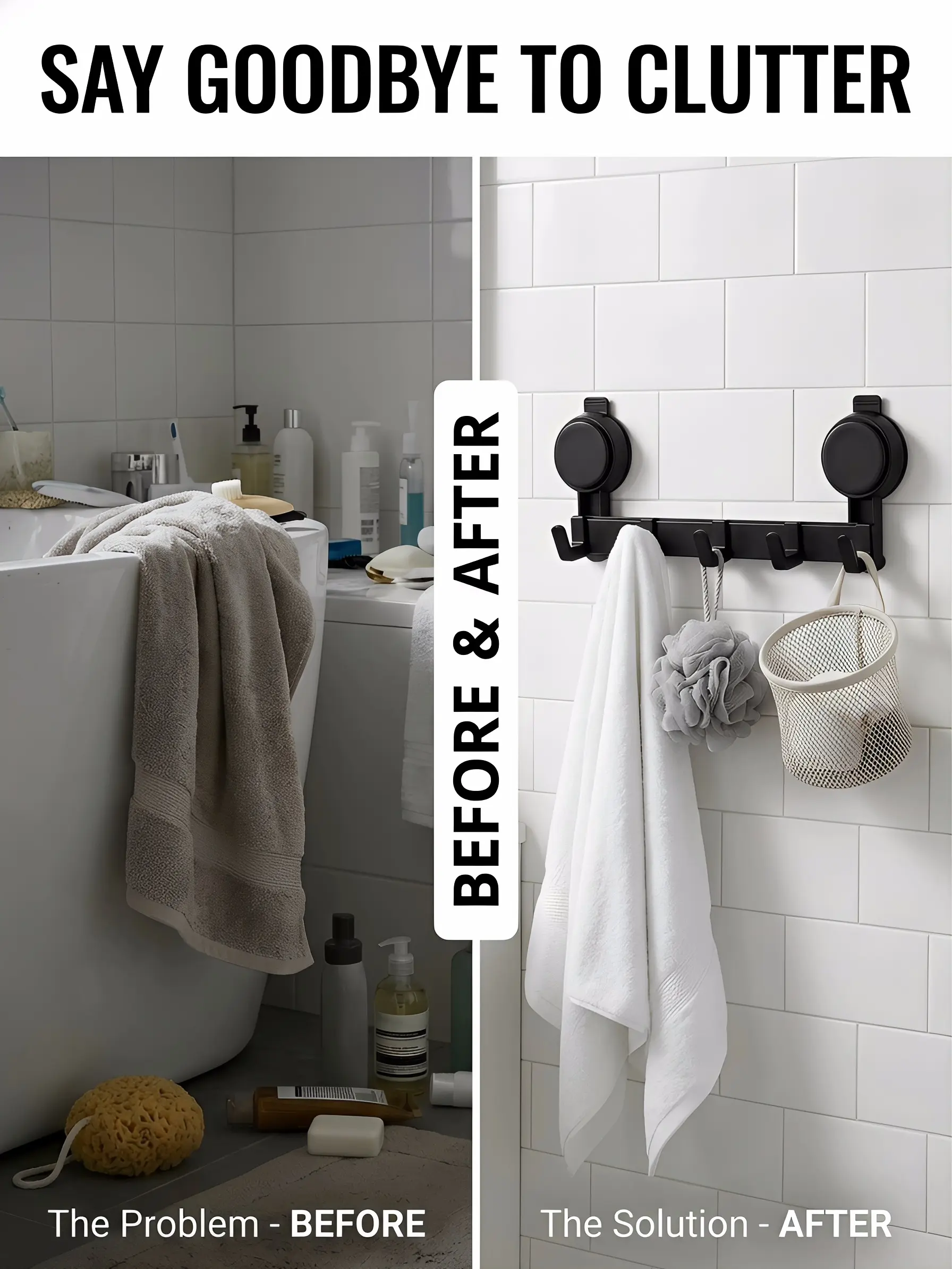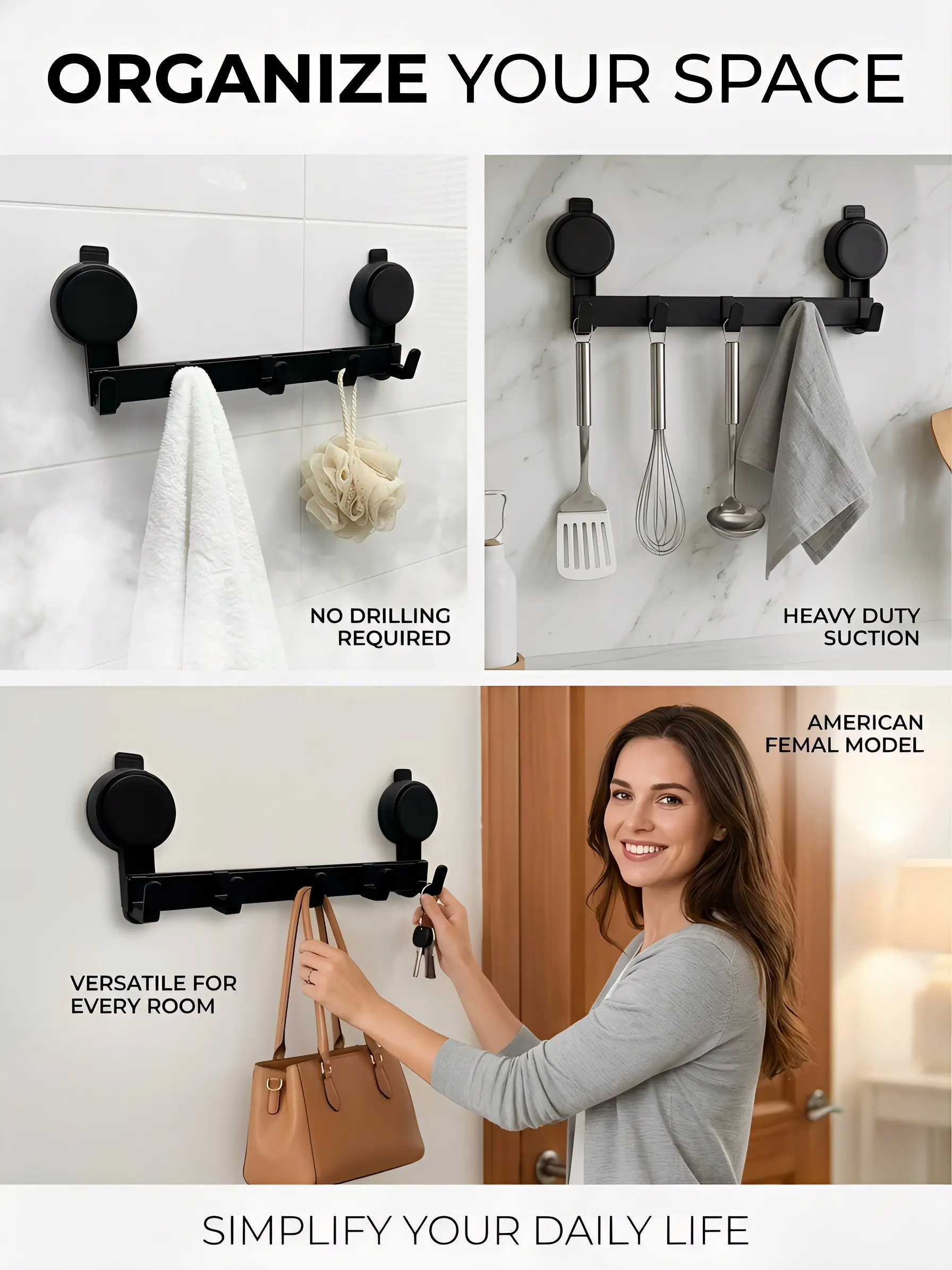 Upgraded vacuum suction cup design, ultra-strong load-bearing capacity. Won't slip or fall even when holding soaking wet thick bathrobes, towels, heavy coats, backpacks or kitchen utensils.