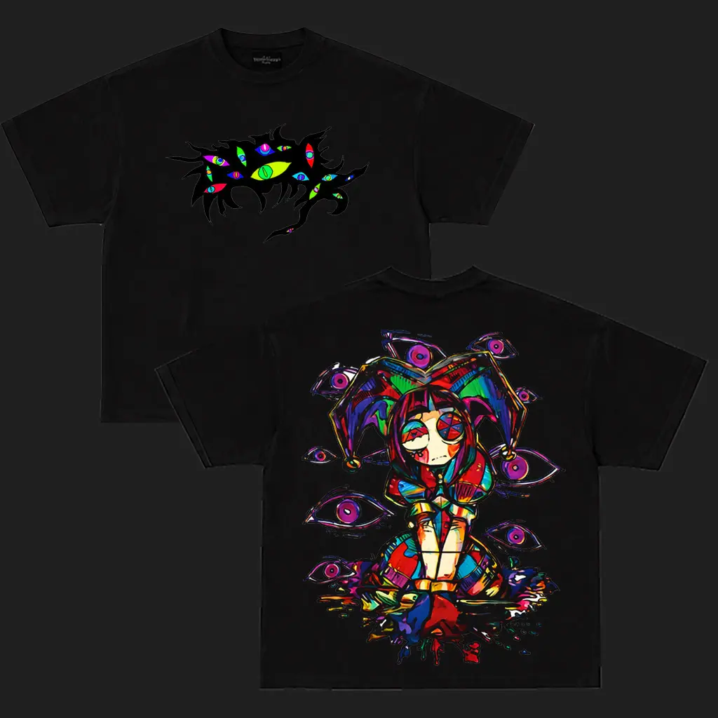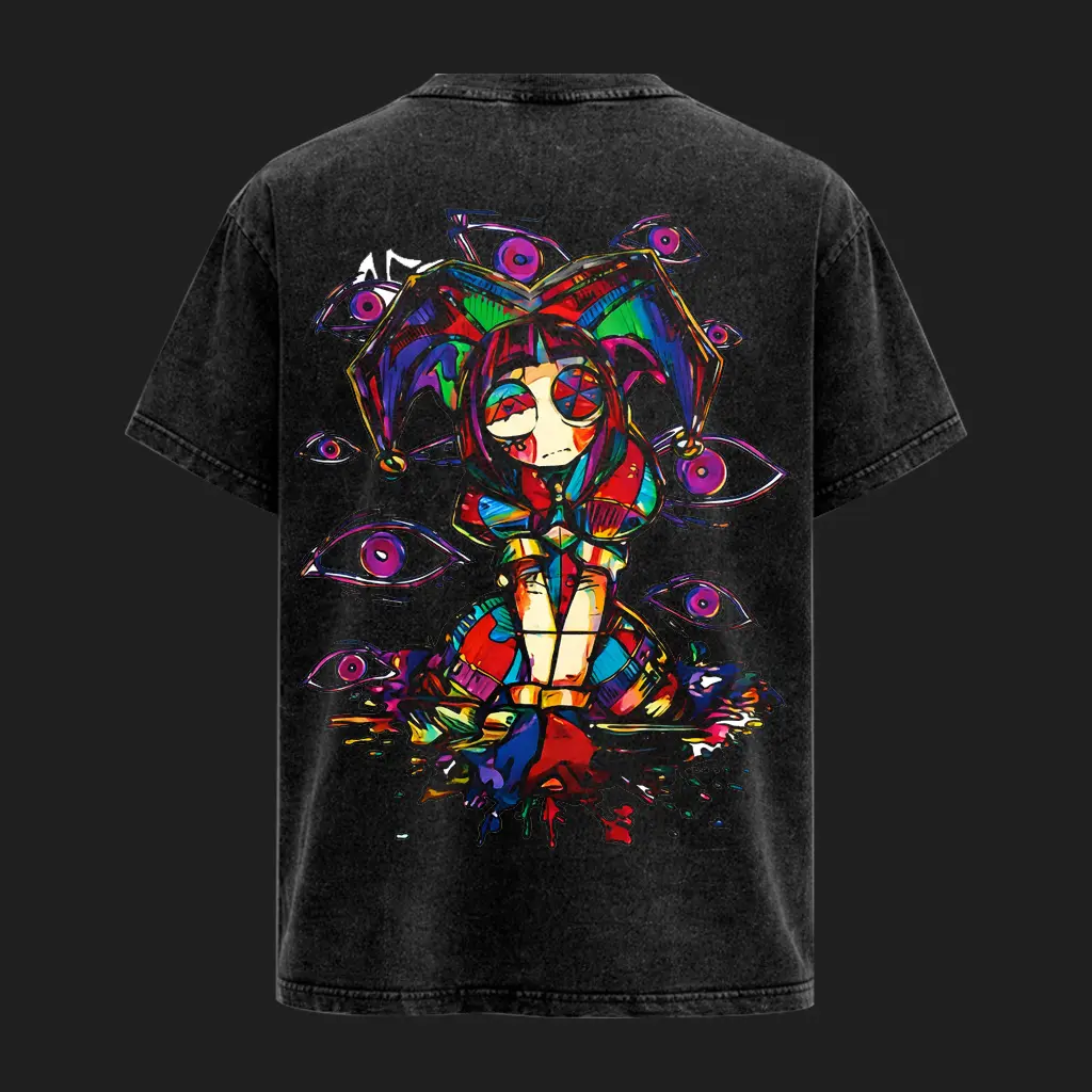 Pomni Digital Circus Horror Style Washed T-Shirt, The Amazing Digital Circus Graphic Tee, Creepy Eye Aesthetic Cartoon Shirt, Oversized Vintage Streetwear Tee