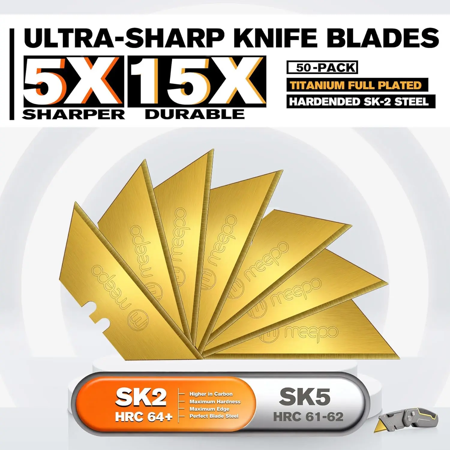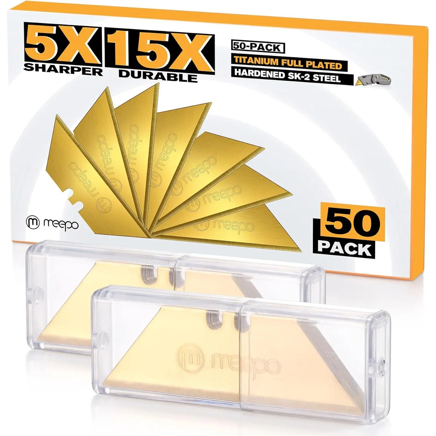 50-Pack Utility Knife Blades, Titanium Fully Plated, Durable SK-2 Razor Blades for Utility Knife Box Cutter, Never Rust, Extra Durable