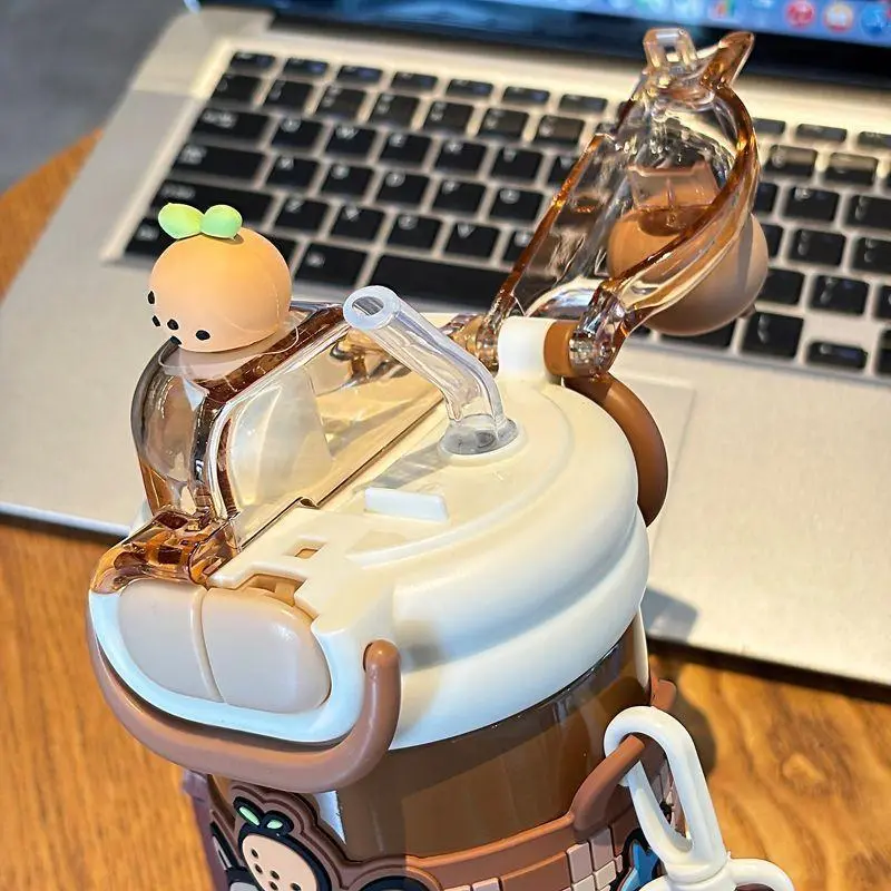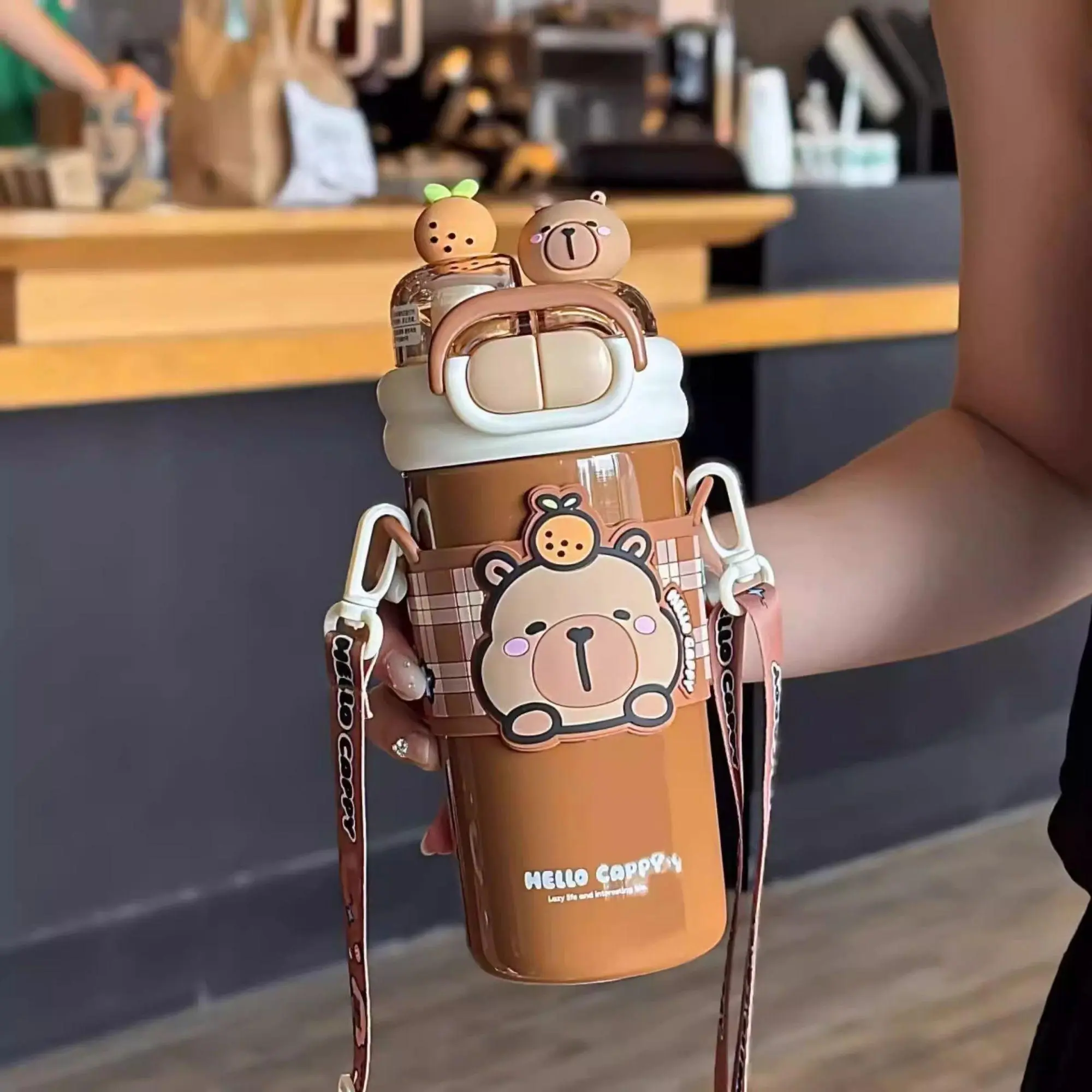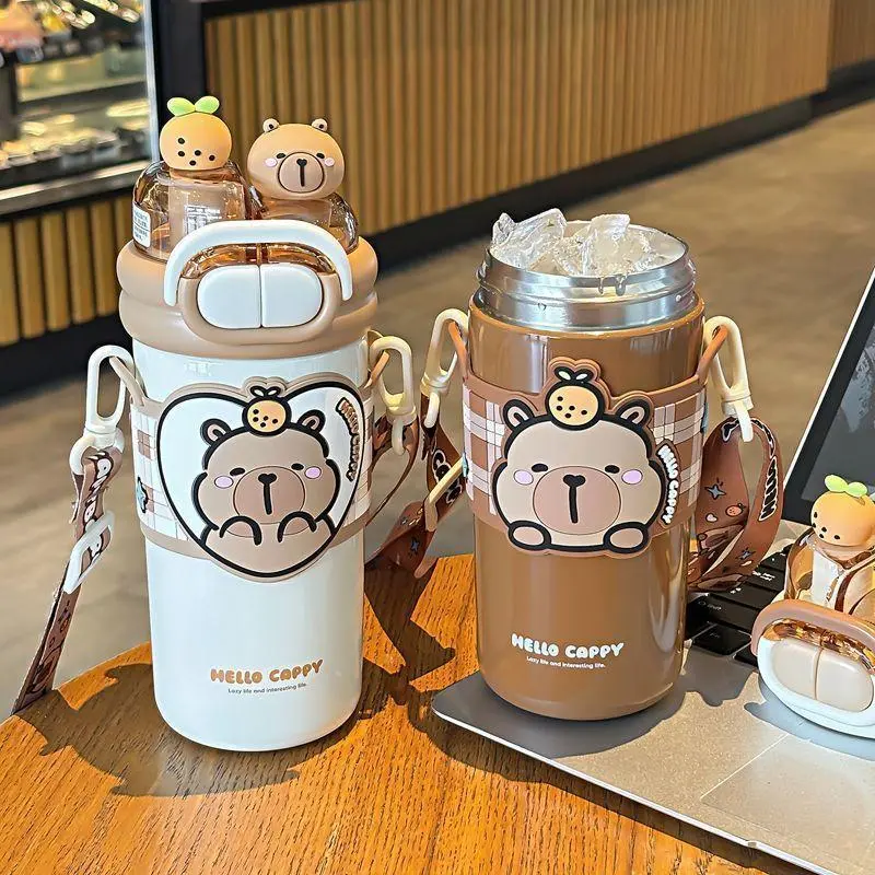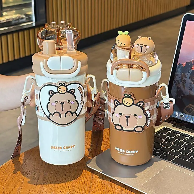 520ml Capybara Children's Straw Insulated Cup for Kids 316 Stainless Steel Cute Cartoon Double Drinking Diagonal Cross Travel Water Bottle