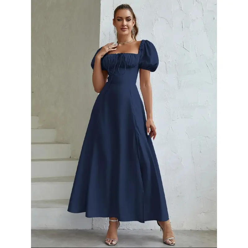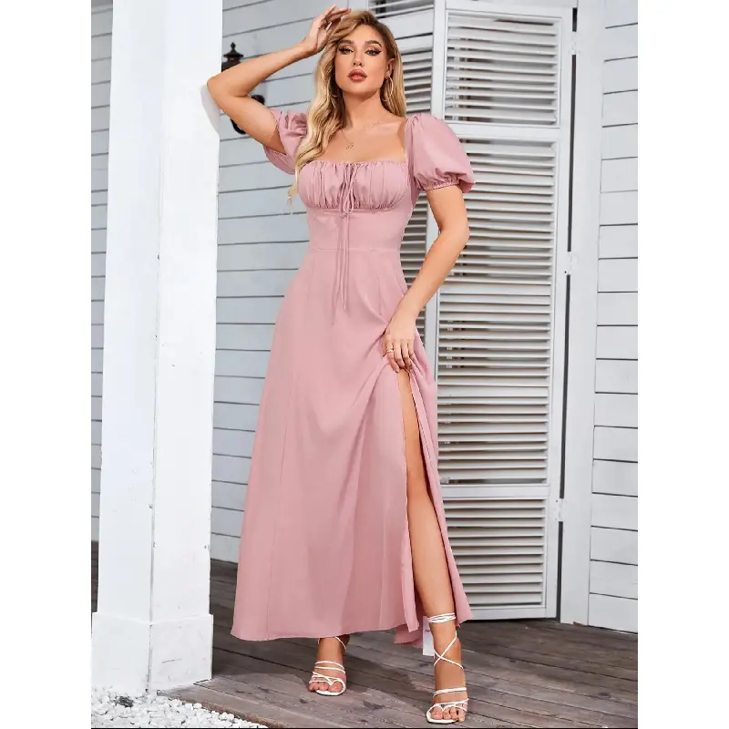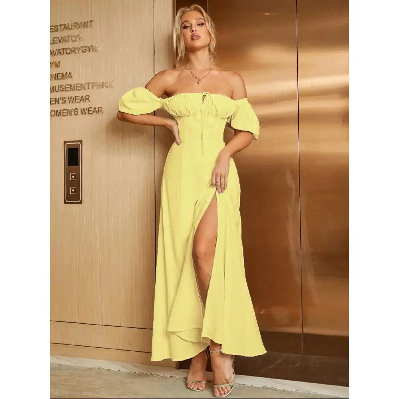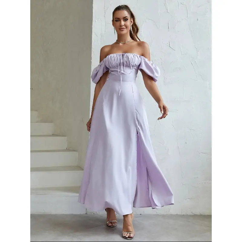 Women'S Off The Shoulder Ruched Tie Front Split Thigh Slit Dress, Elegant Puff Sleeve A Line Long Dress For Party Holiday Dating Wear, Chic Milkmaid Dress, Ladies Summer Clothes Fit