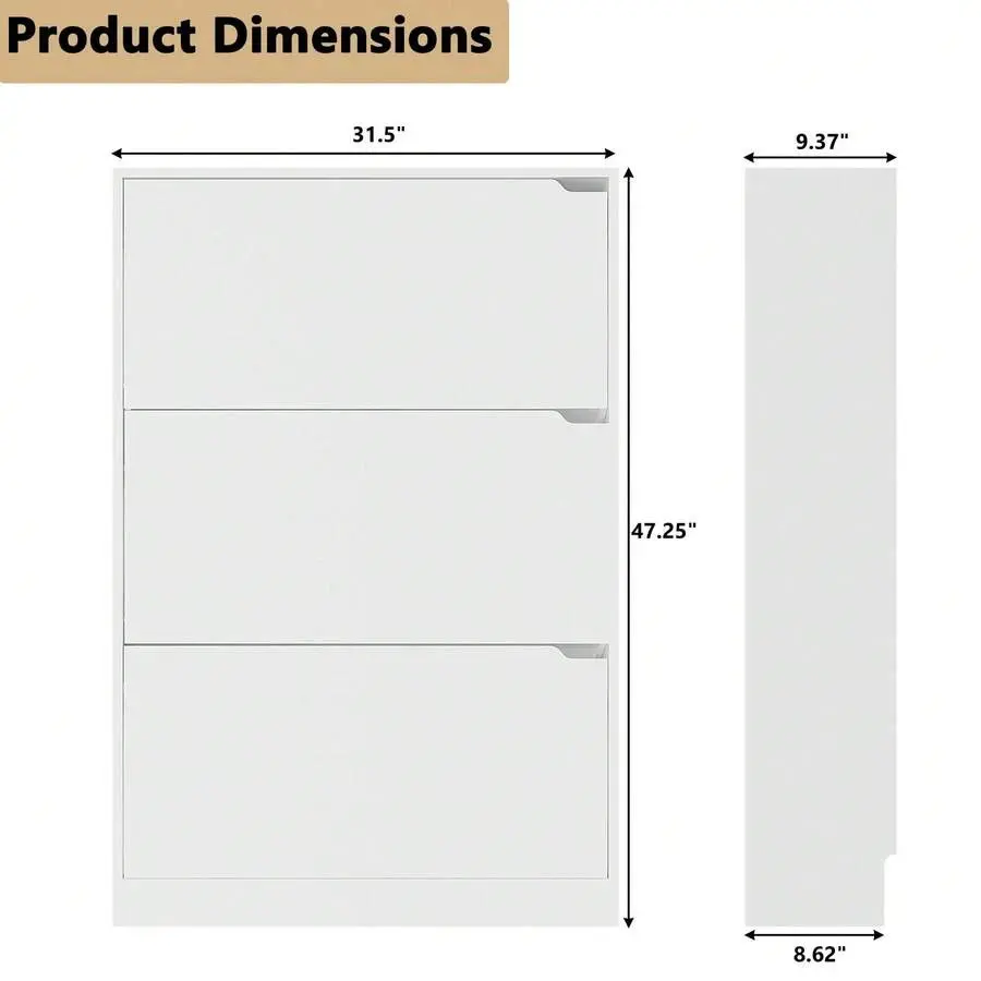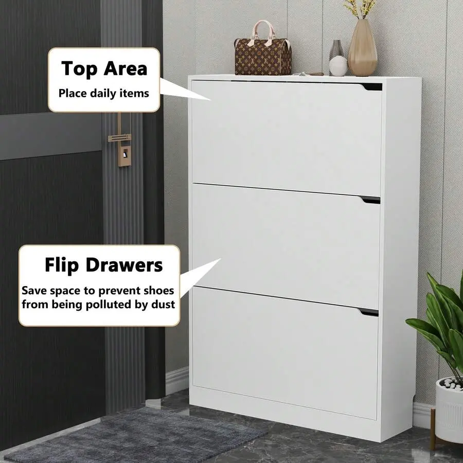 Equipped with an anti-tipping device, this entryway shoe cabinet can be securely fixed to the wall, preventing tipping and ensuring safety for families with kids or pets.It features 3 flip drawers, each with two layers of storage space, allowing you to store a large number of shoes without taking up too much room.